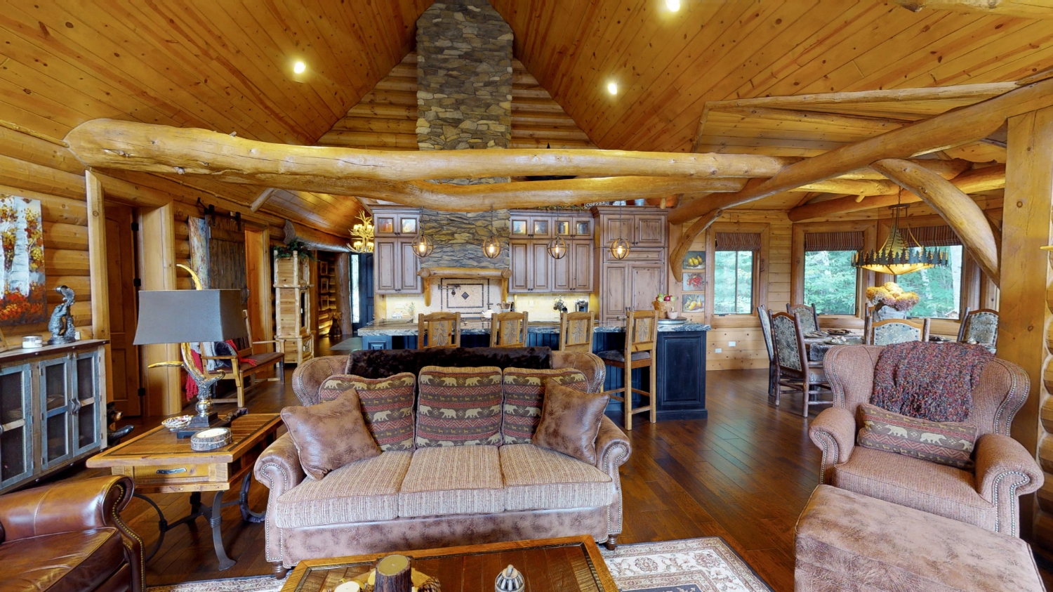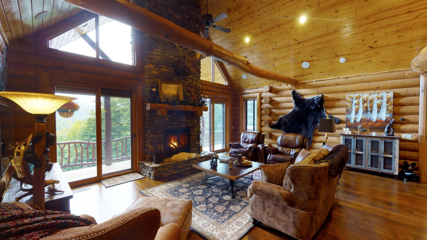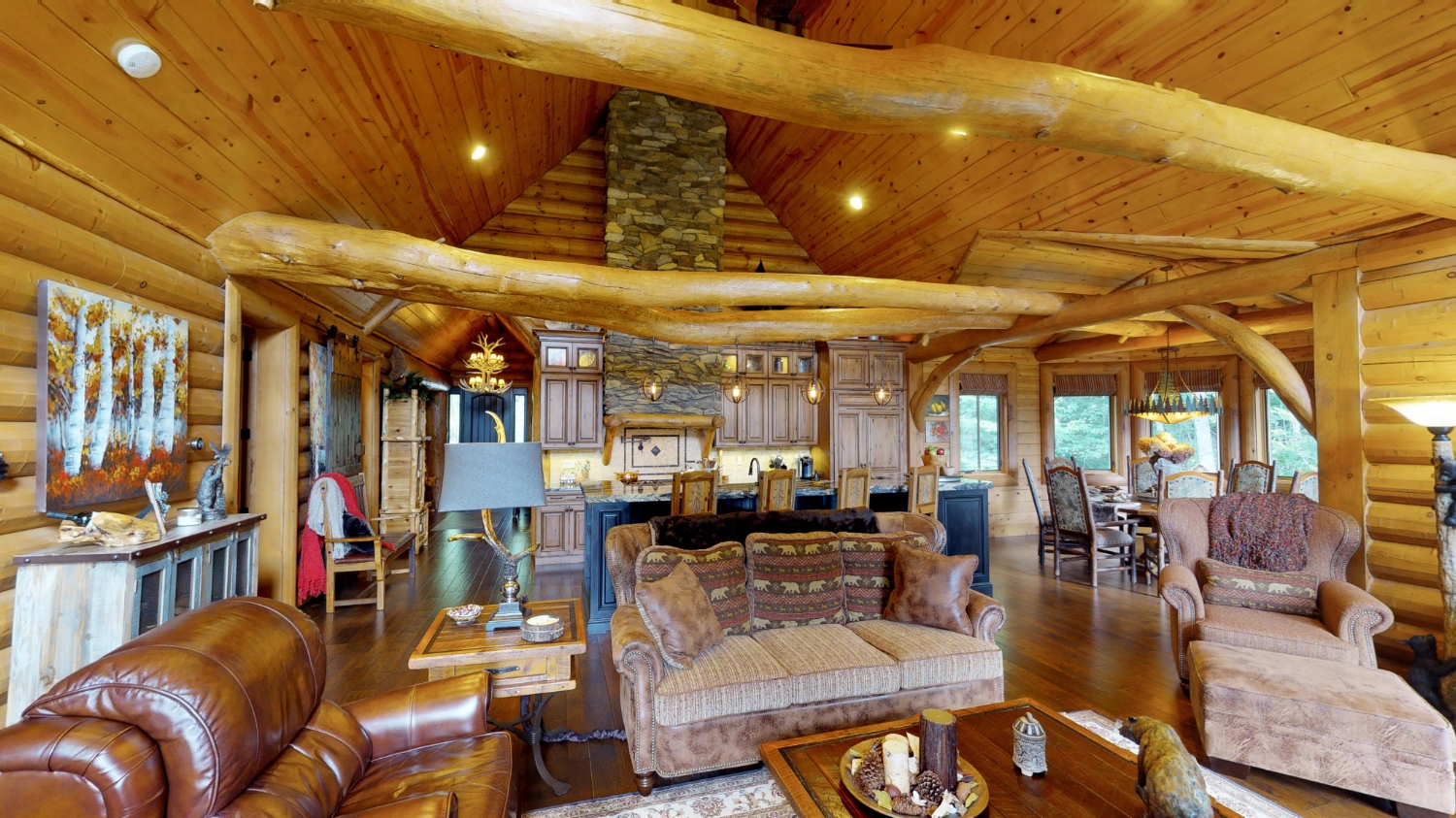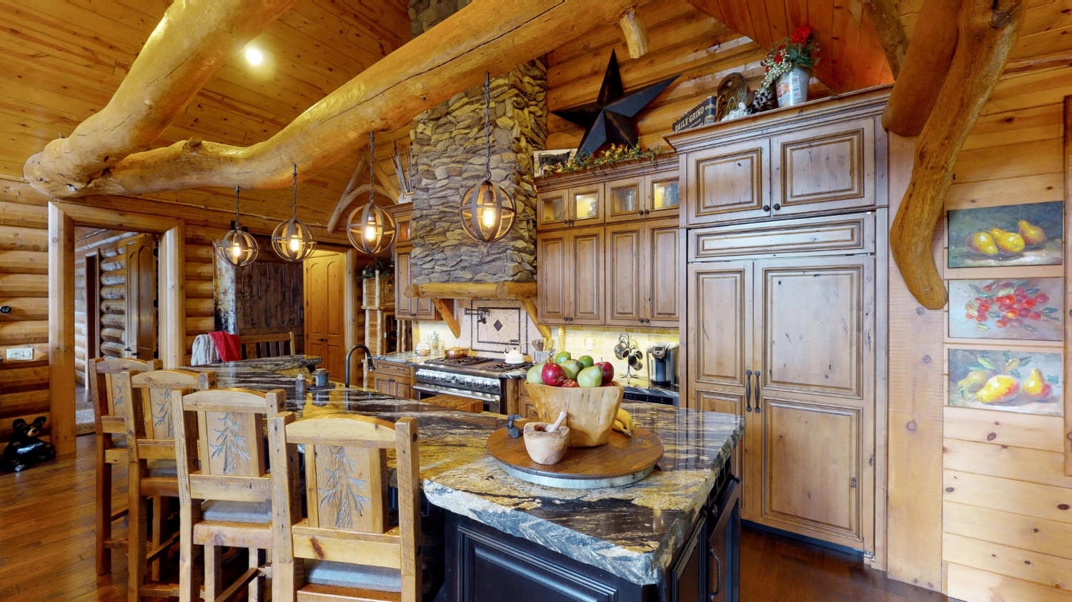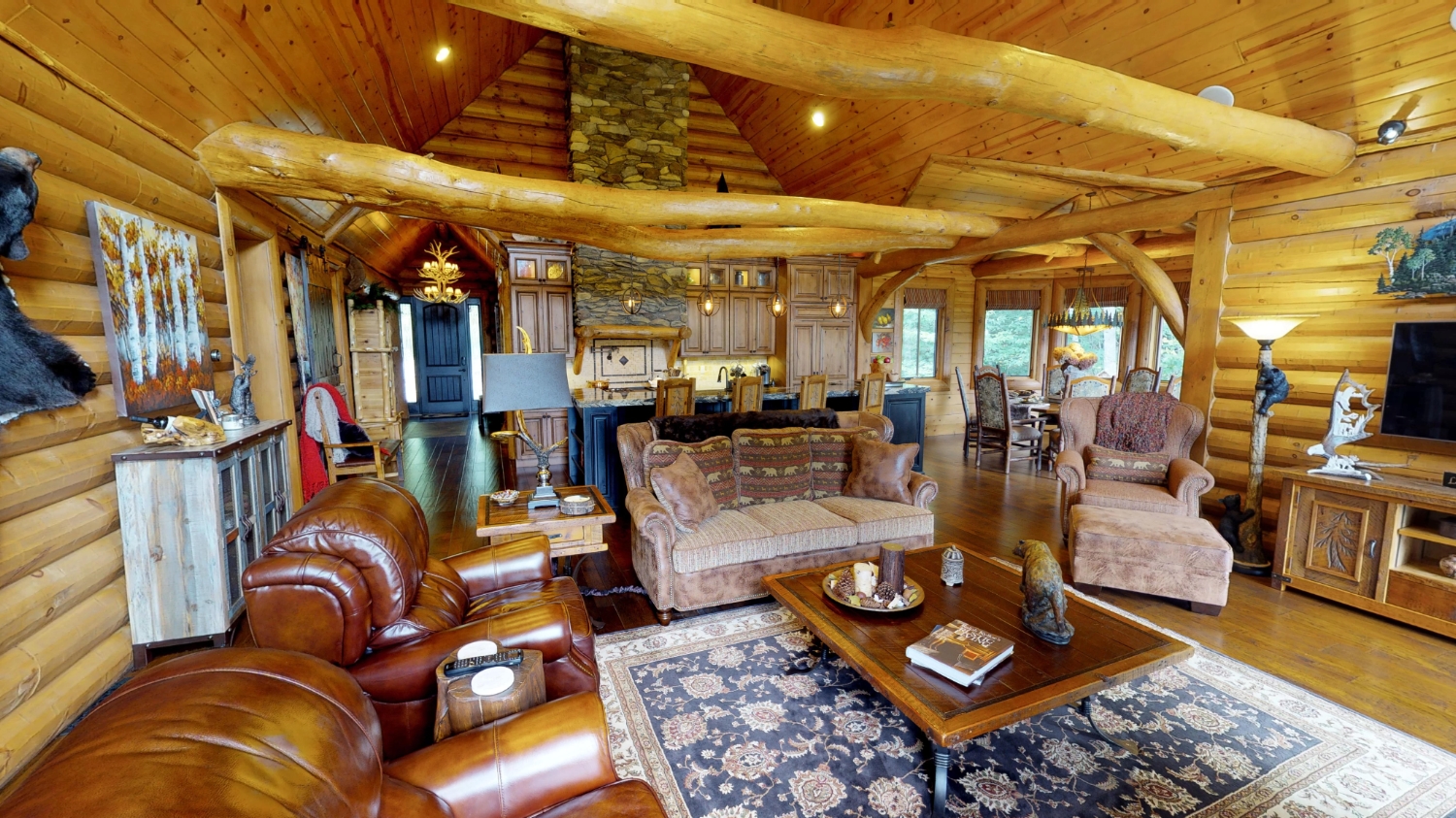 This stunning Custom South Carolina 2310AR is perched on a hillside with a view of the nearby mountains. When coming up the driveway you are given an amazing view of this majestic log home. Inside you see a number of wall types. It is a buffet of visuals for the eyes.