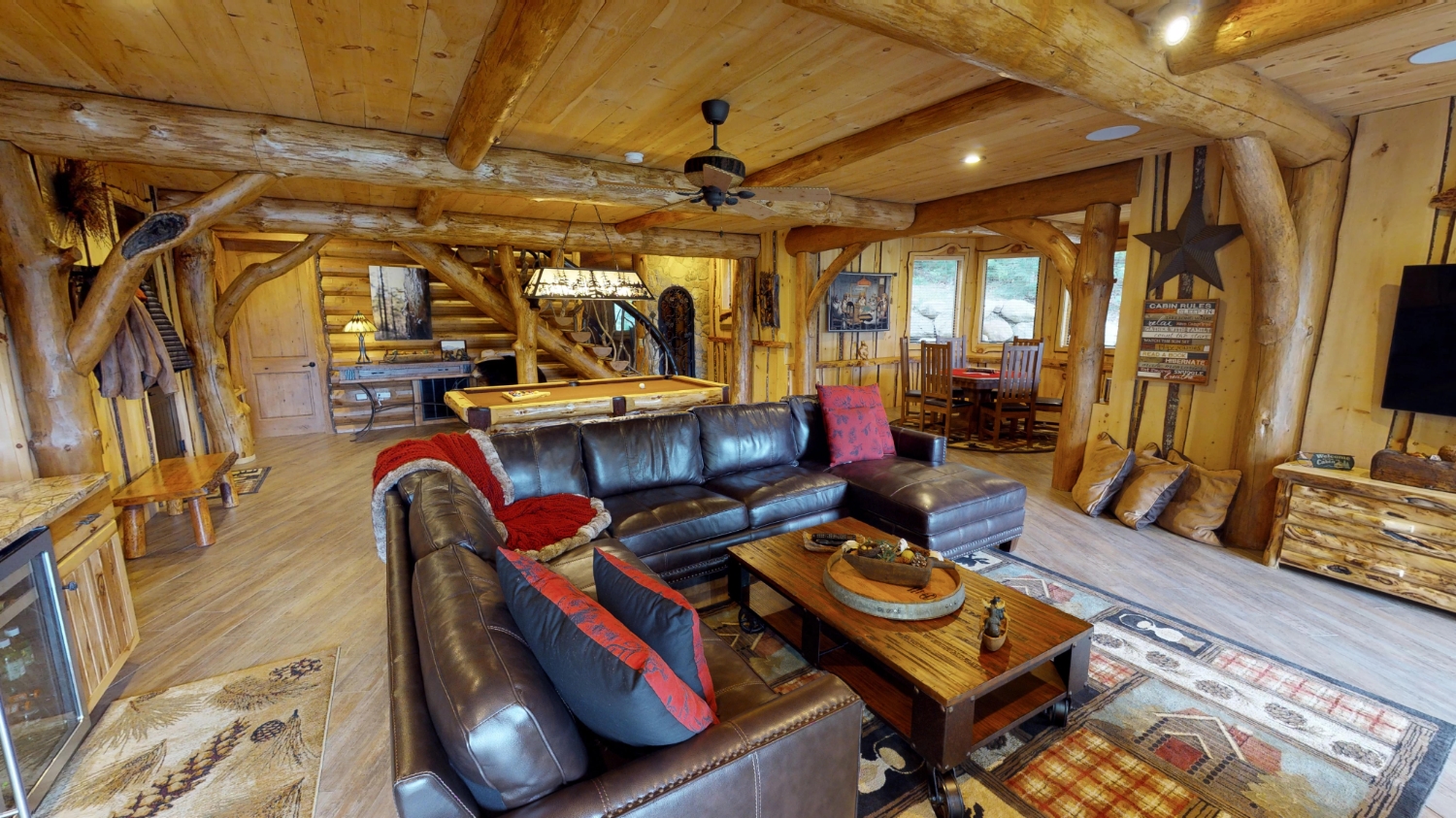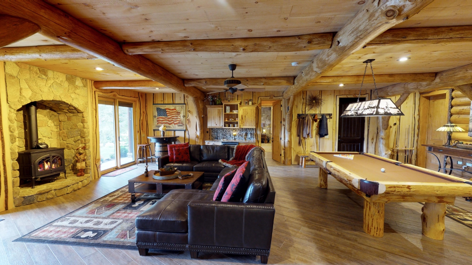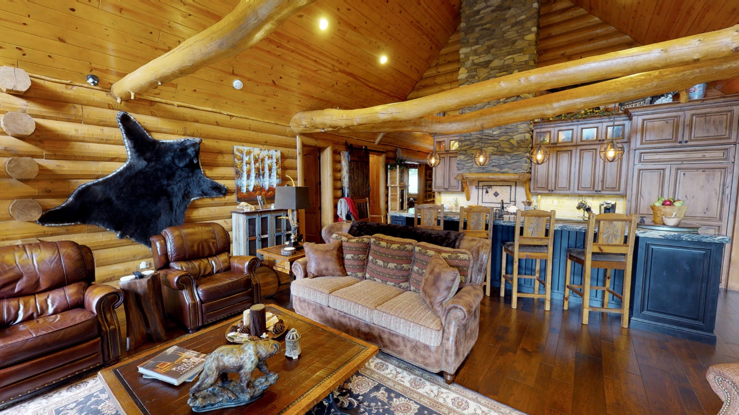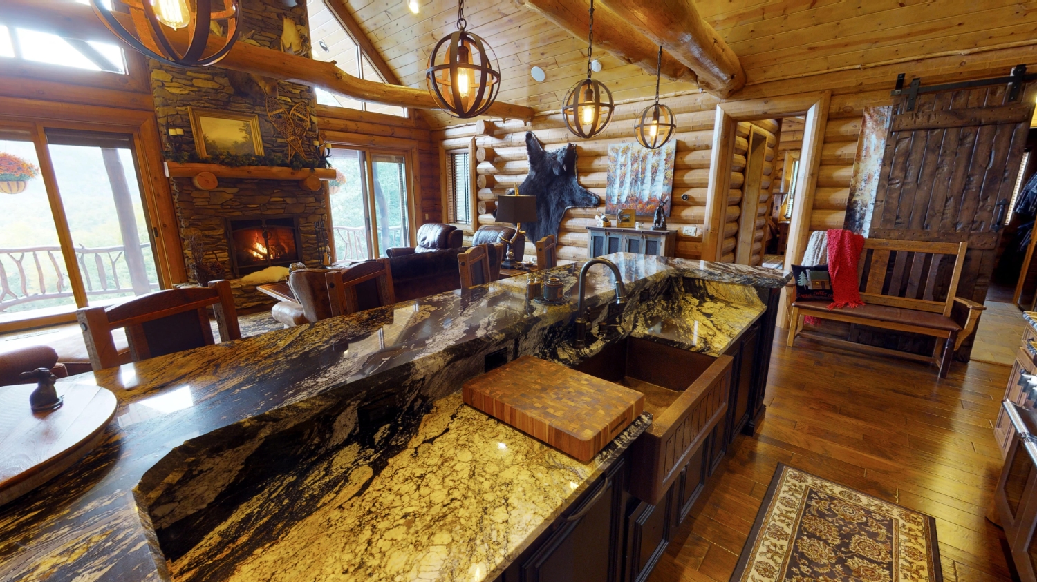 This stunning Custom South Carolina 2310AR is perched on a hillside with a view of the nearby mountains. When coming up the driveway you are given an amazing view of this majestic log home. Inside you see a number of wall types. It is a buffet of visuals for the eyes.