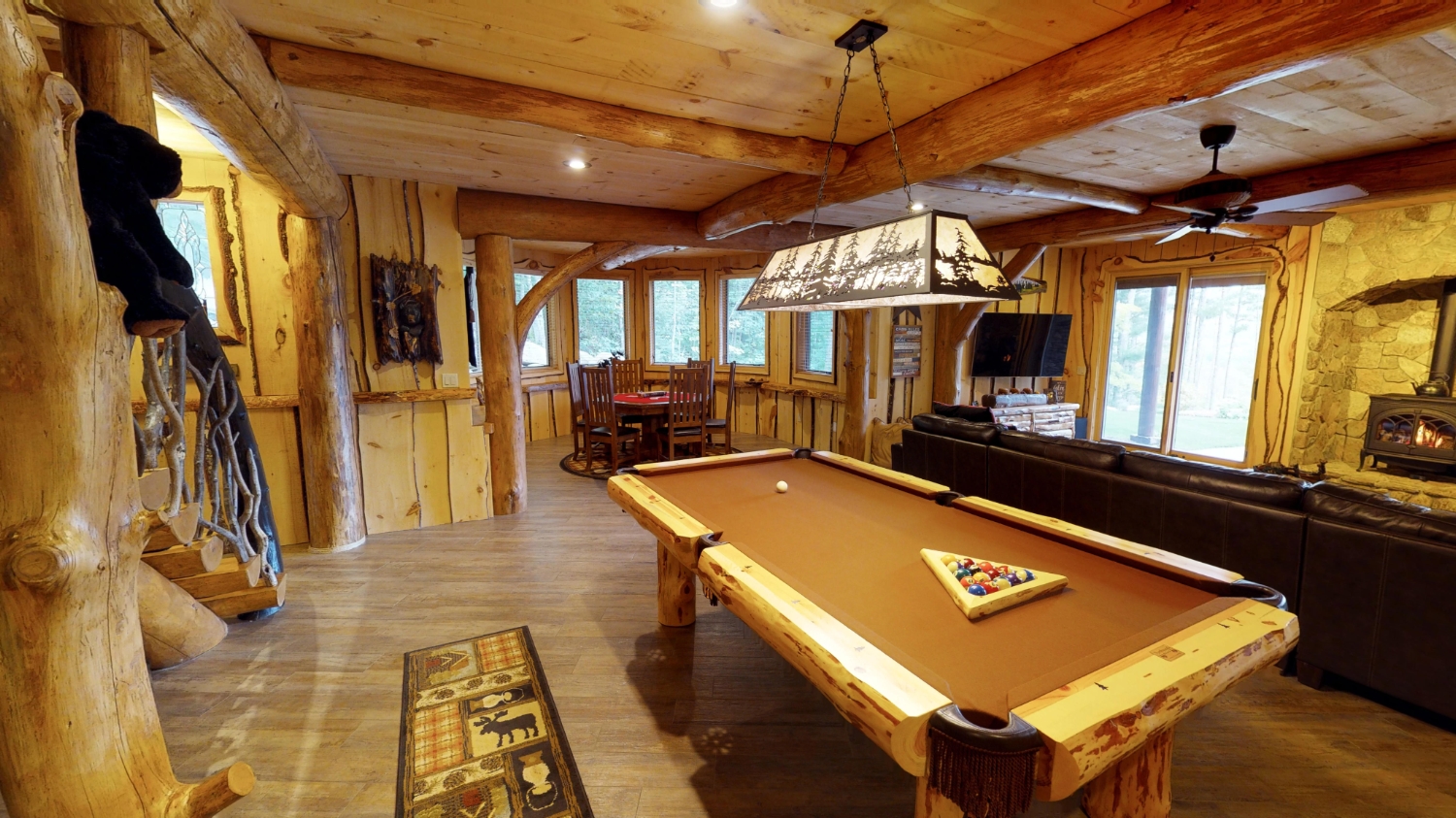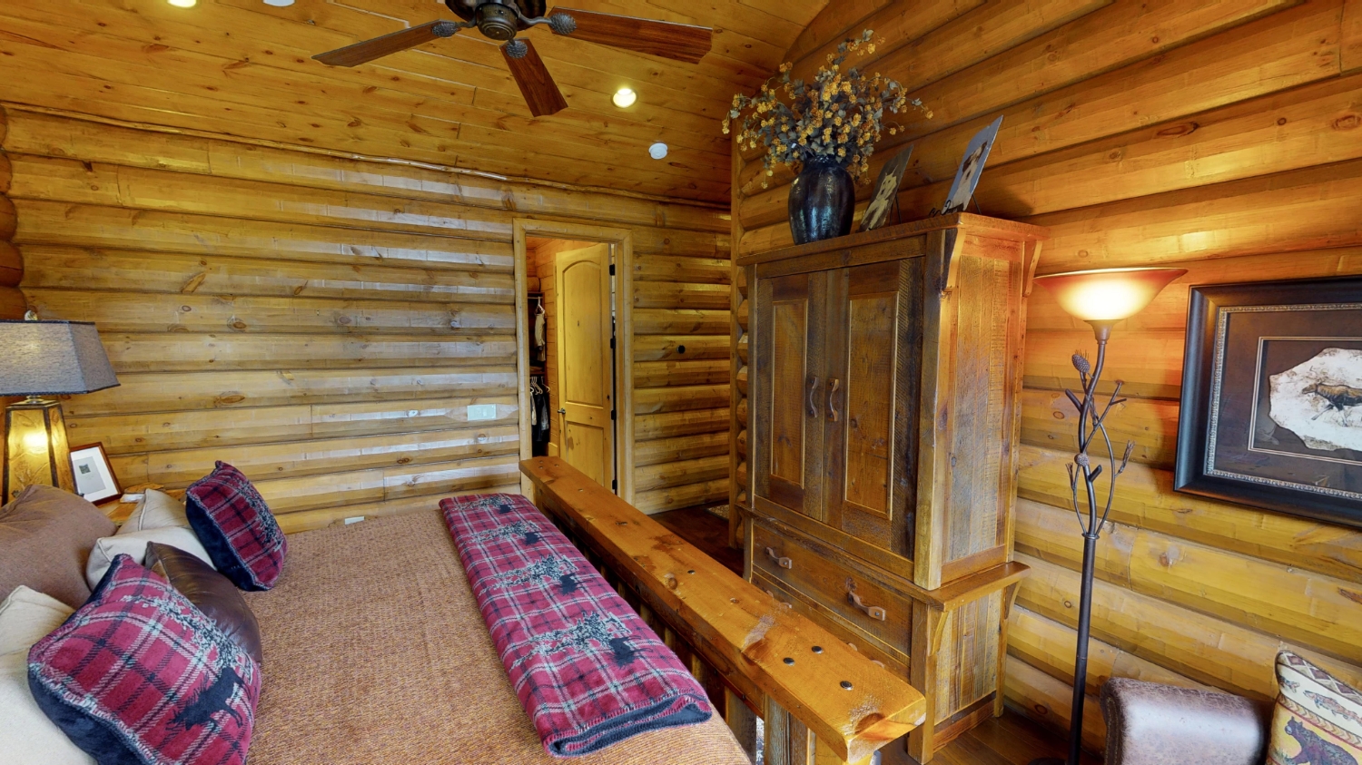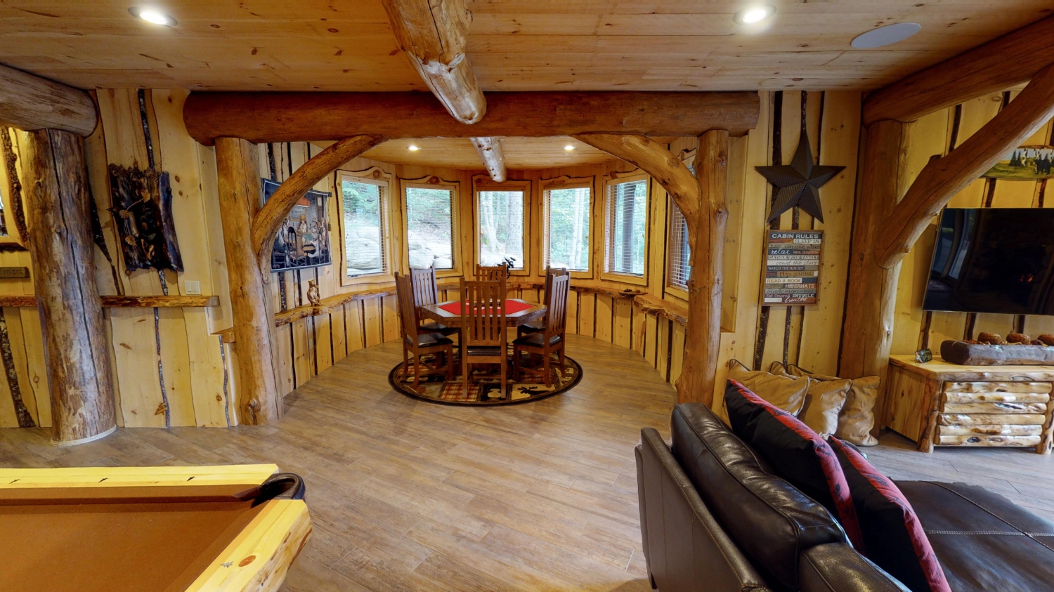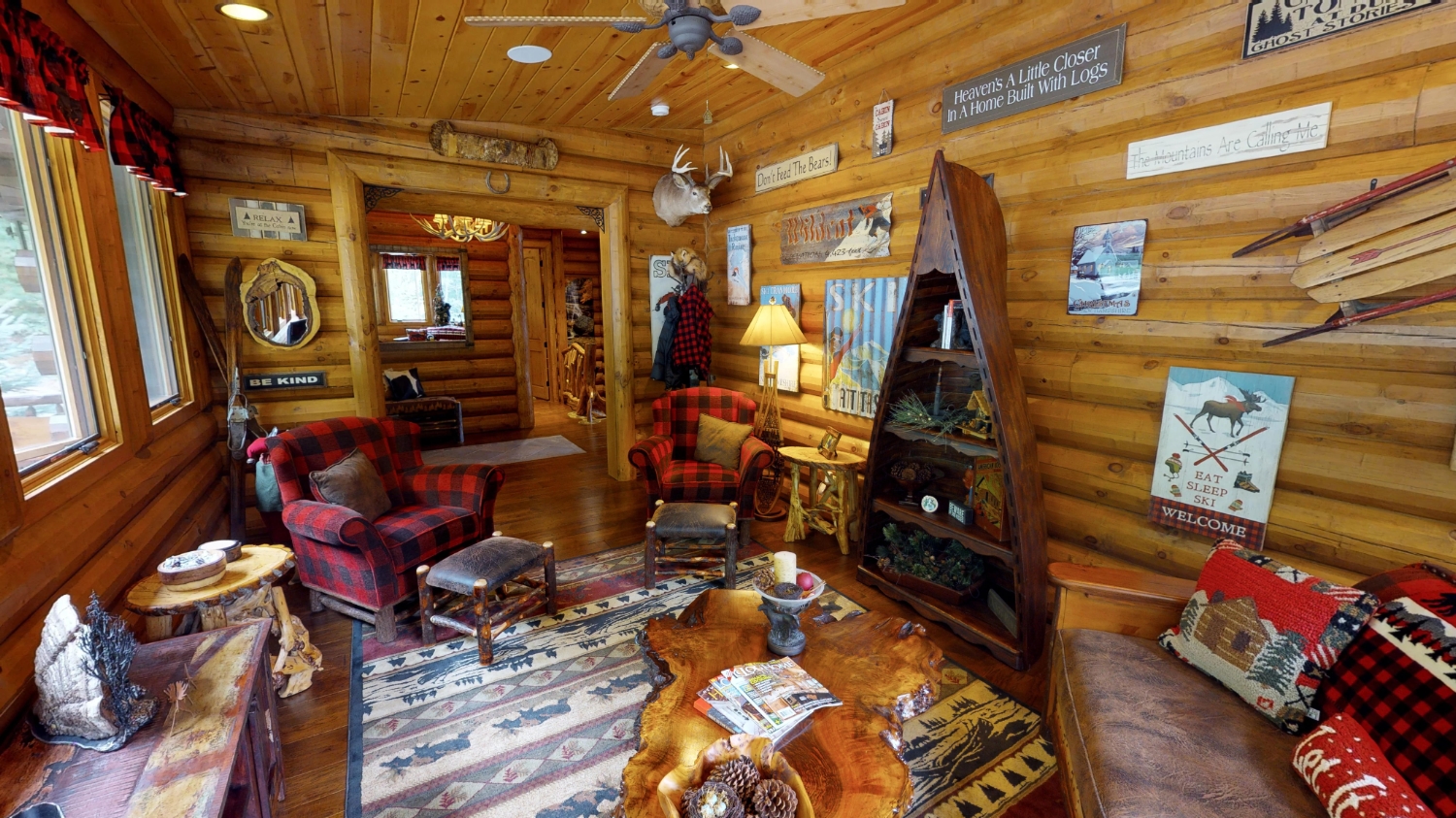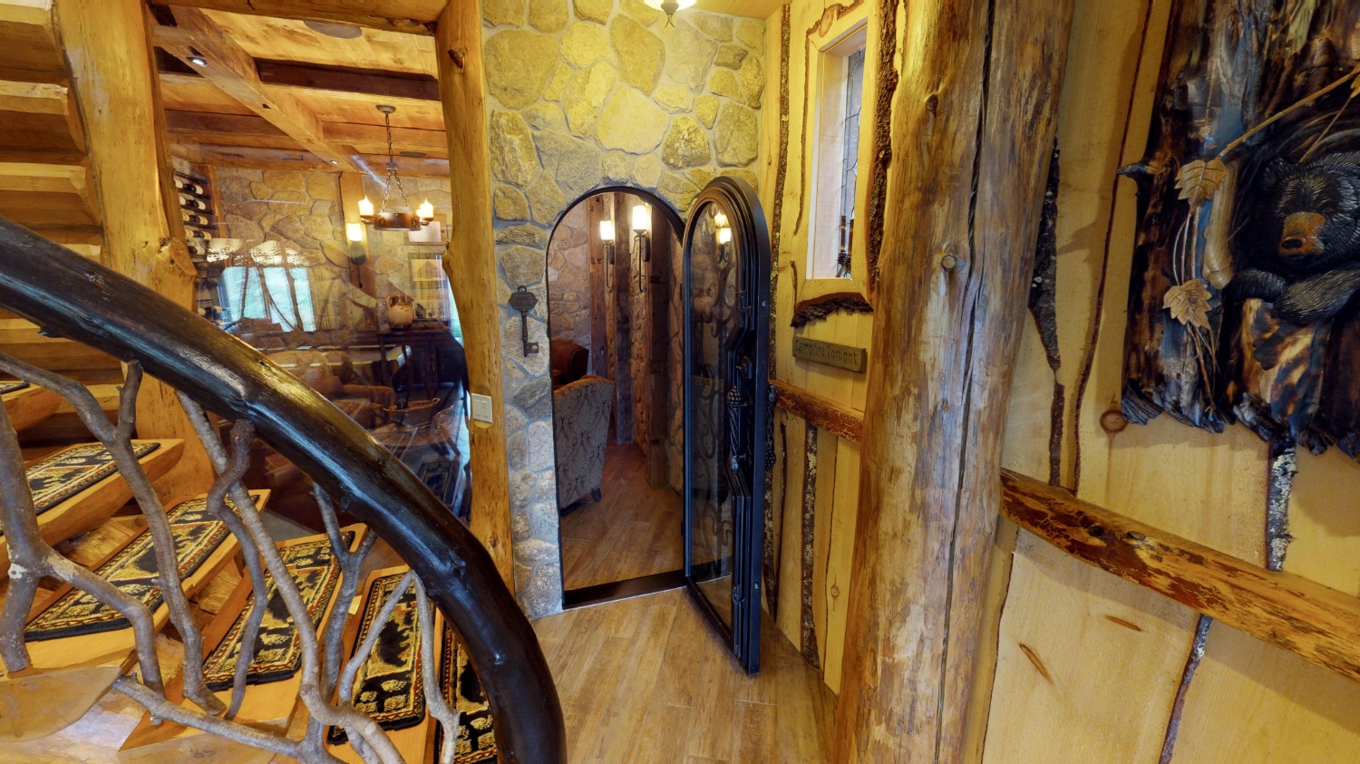 This stunning Custom South Carolina 2310AR is perched on a hillside with a view of the nearby mountains. When coming up the driveway you are given an amazing view of this majestic log home. Inside you see a number of wall types. It is a buffet of visuals for the eyes.
