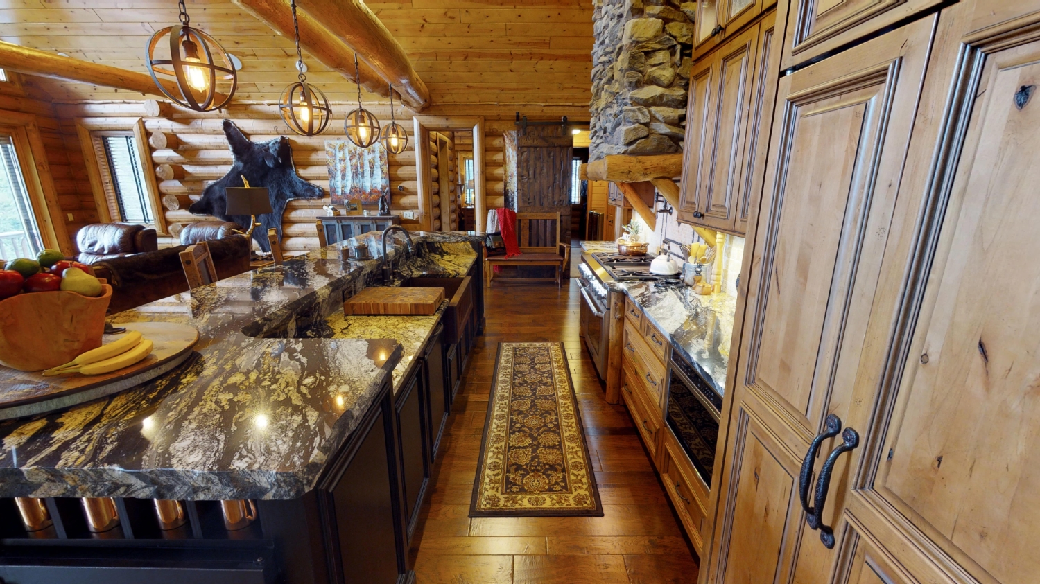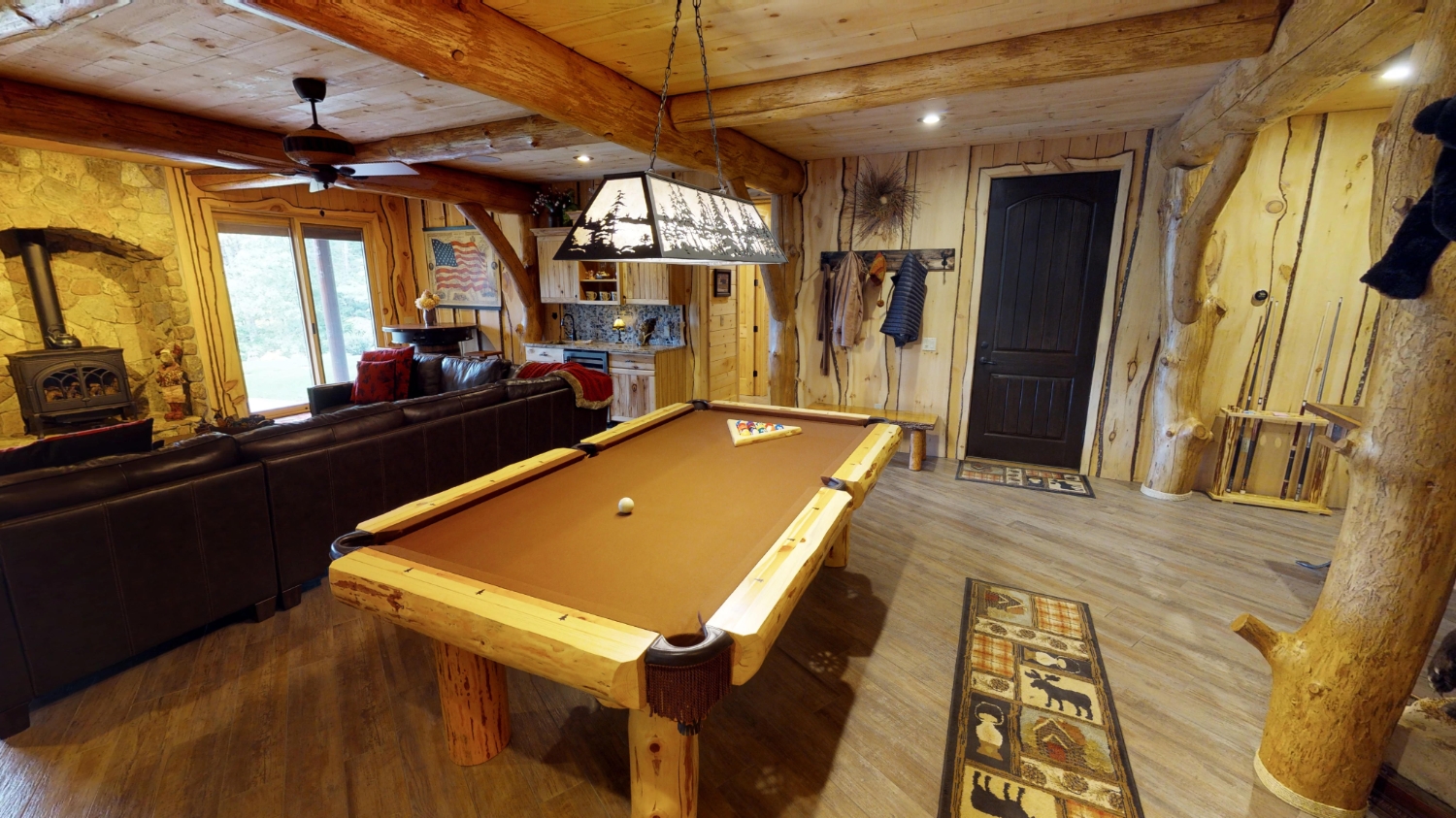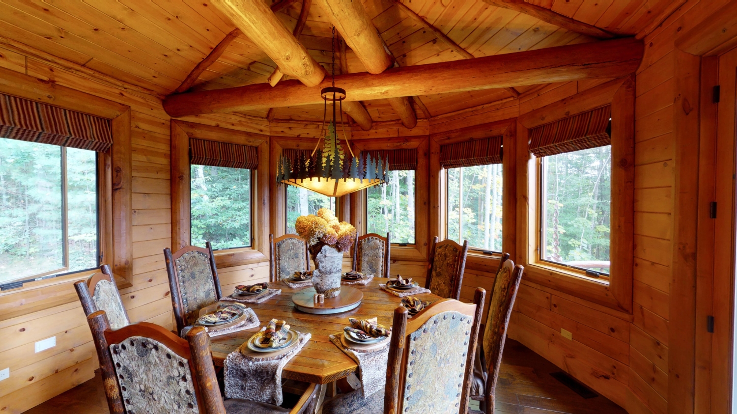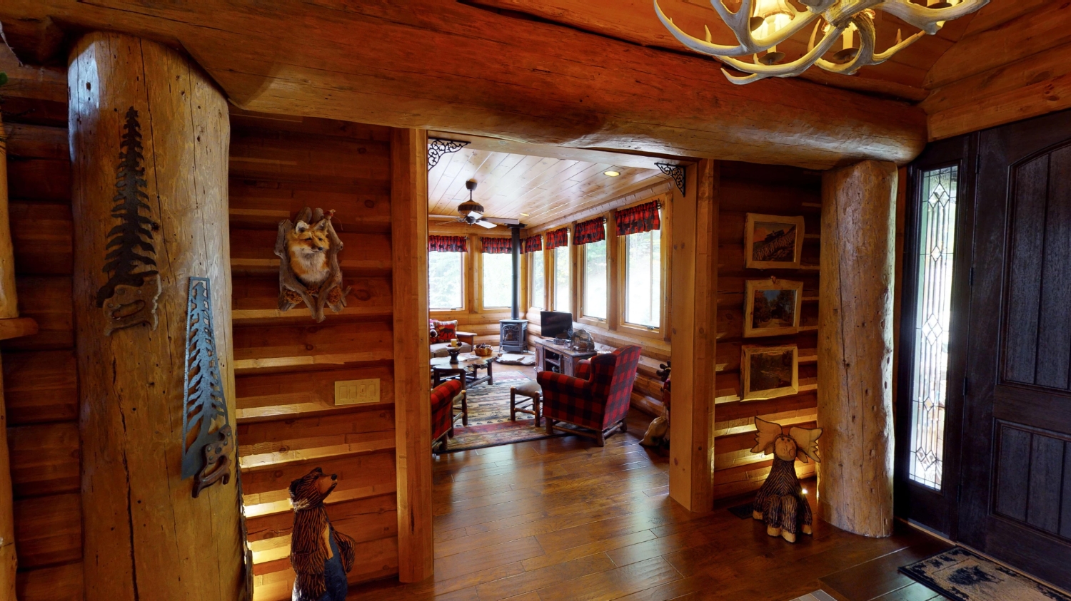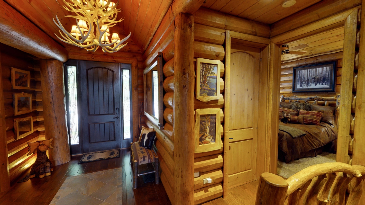 This stunning Custom South Carolina 2310AR is perched on a hillside with a view of the nearby mountains. When coming up the driveway you are given an amazing view of this majestic log home. Inside you see a number of wall types. It is a buffet of visuals for the eyes.