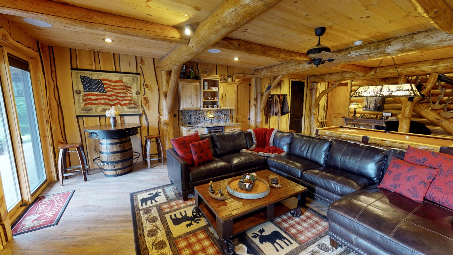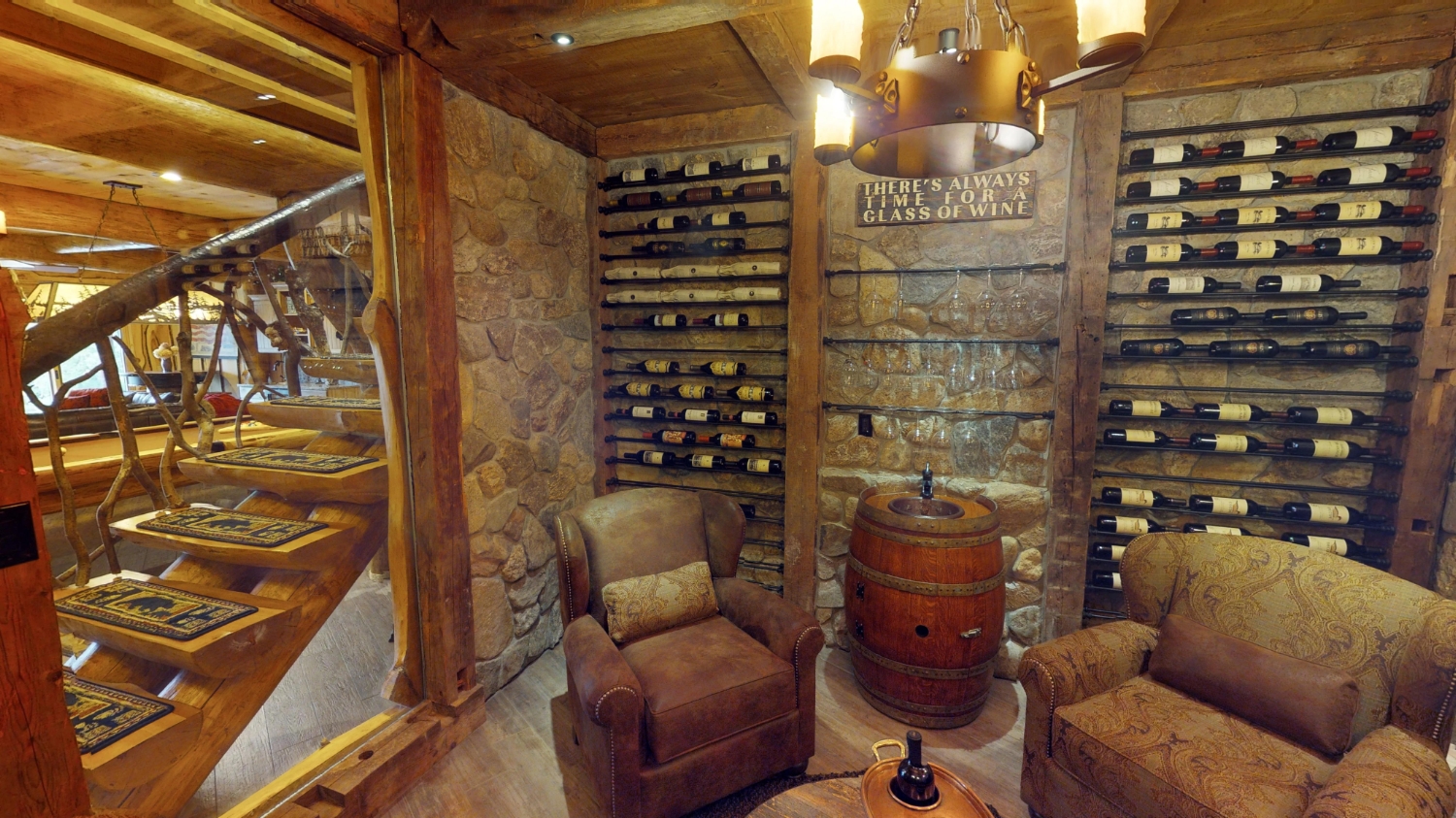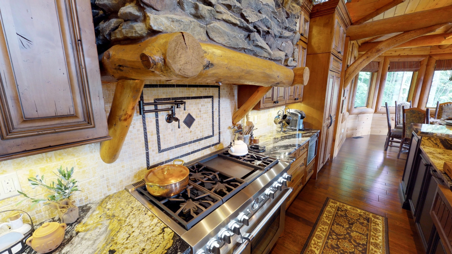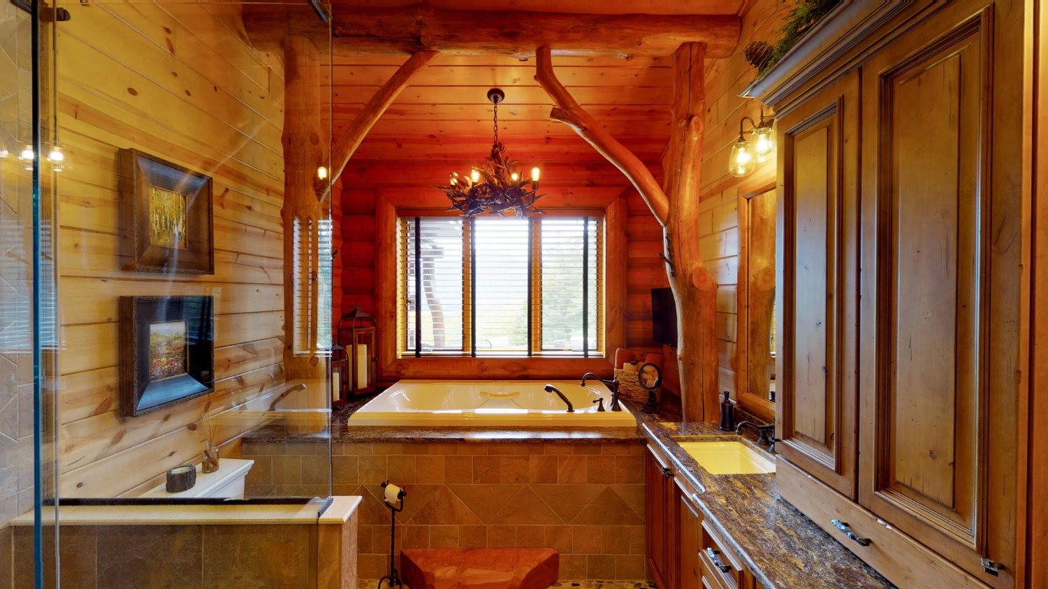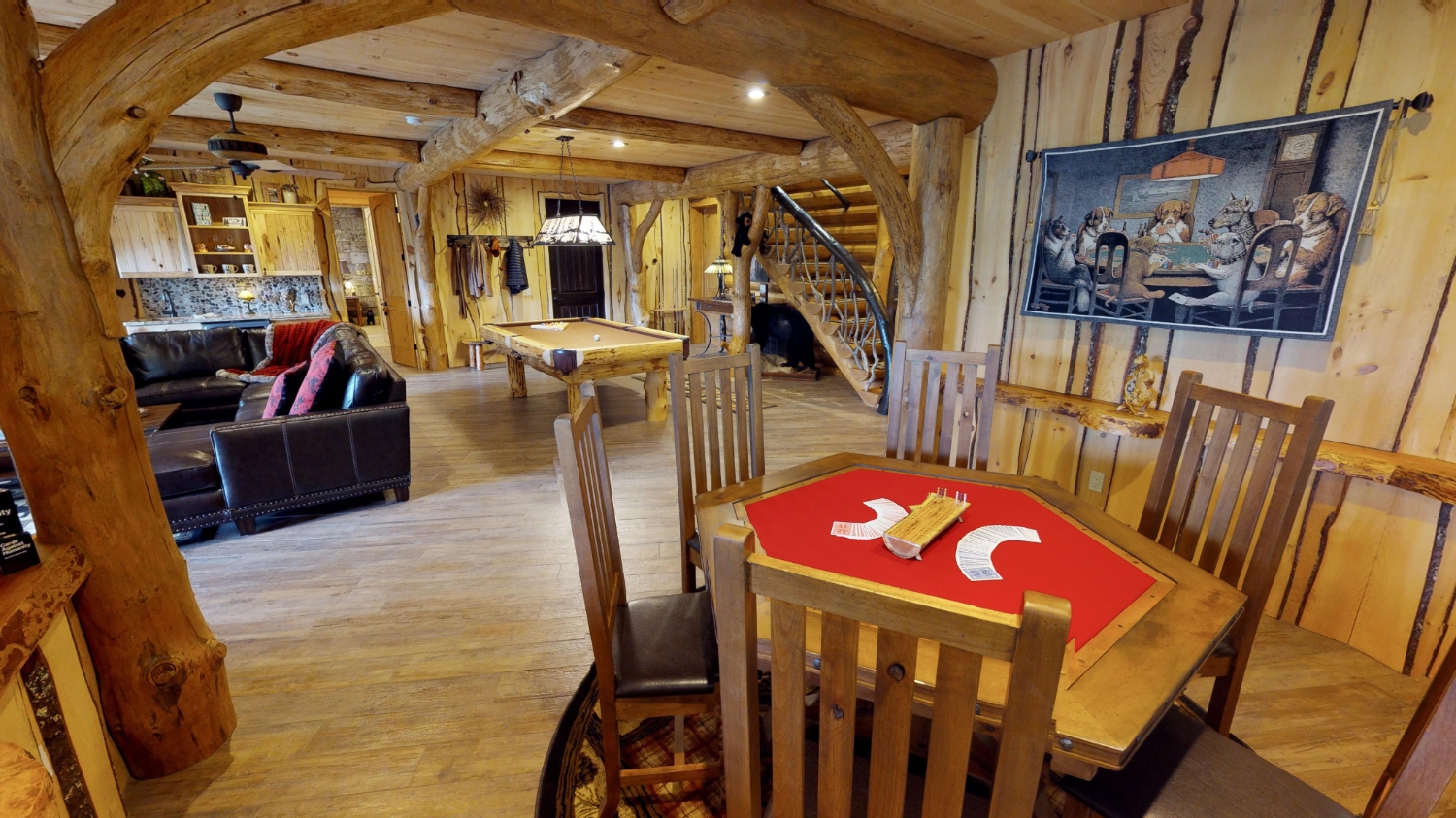 This stunning Custom South Carolina 2310AR is perched on a hillside with a view of the nearby mountains. When coming up the driveway you are given an amazing view of this majestic log home. Inside you see a number of wall types. It is a buffet of visuals for the eyes.
