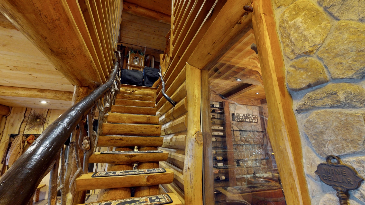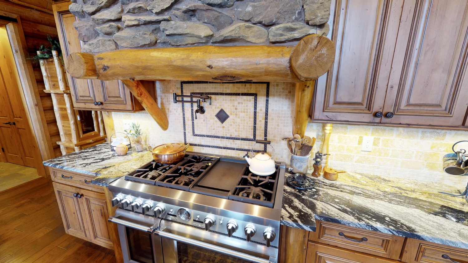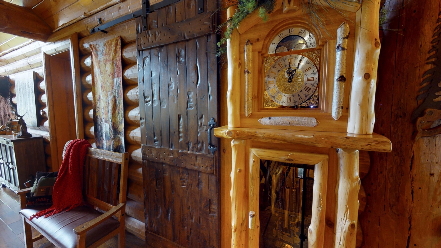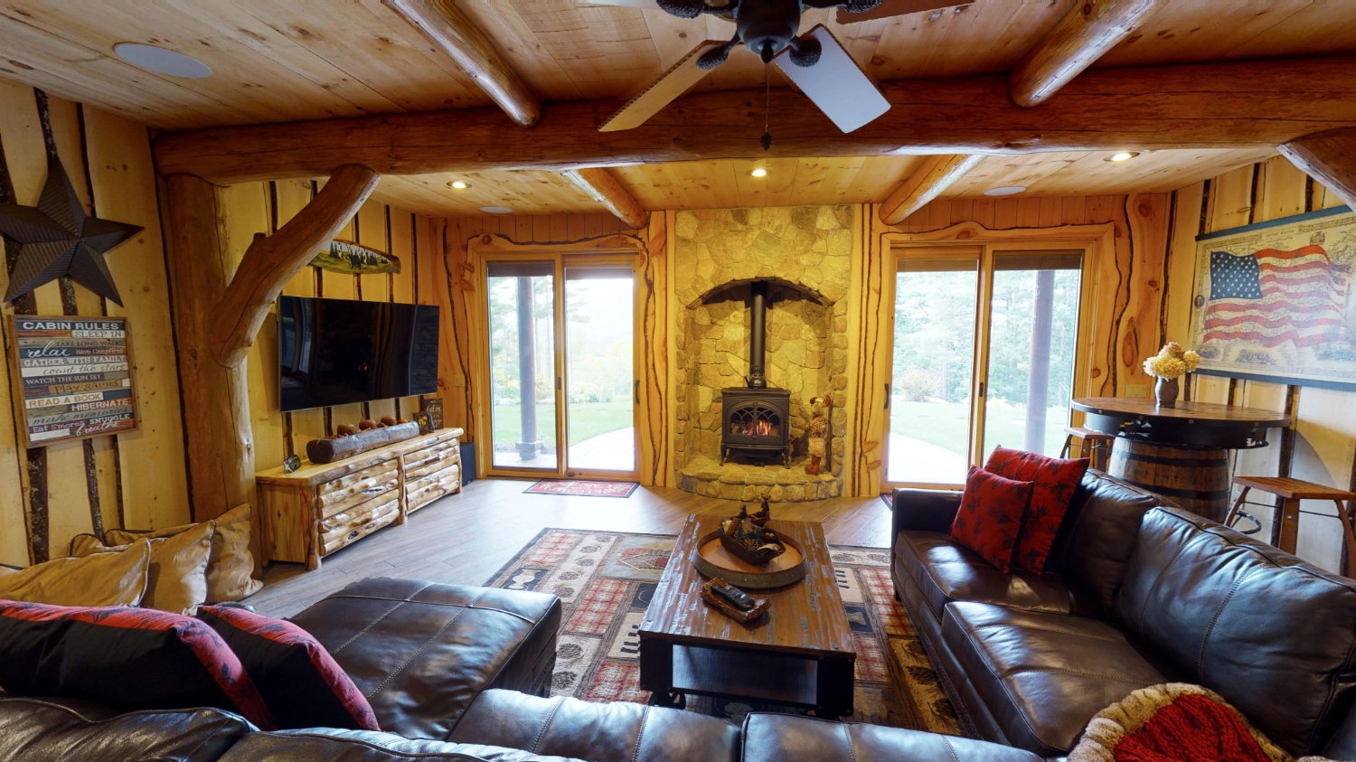 This stunning Custom South Carolina 2310AR is perched on a hillside with a view of the nearby mountains. When coming up the driveway you are given an amazing view of this majestic log home. Inside you see a number of wall types. It is a buffet of visuals for the eyes.