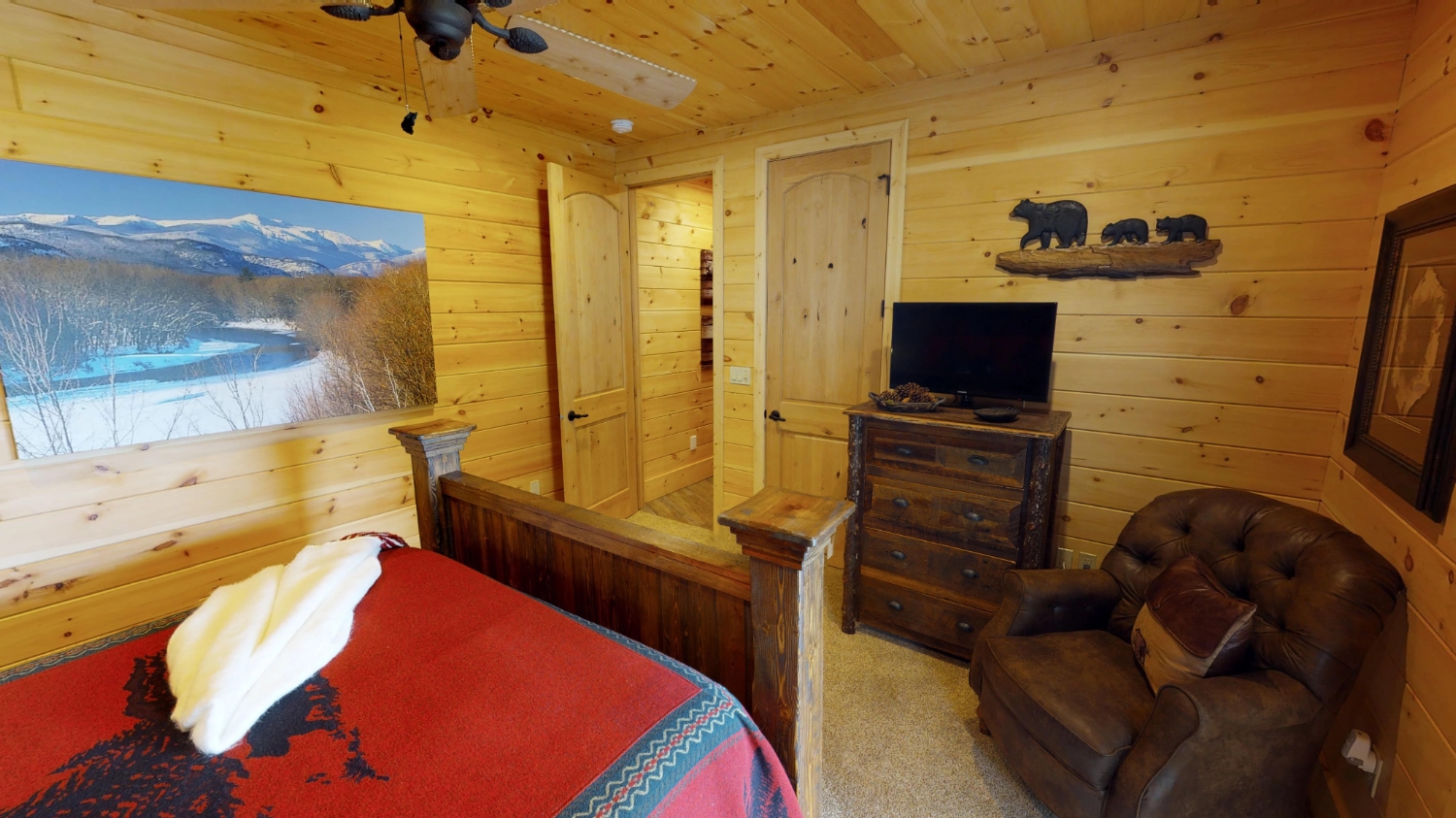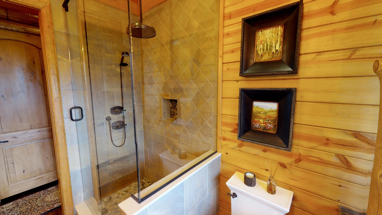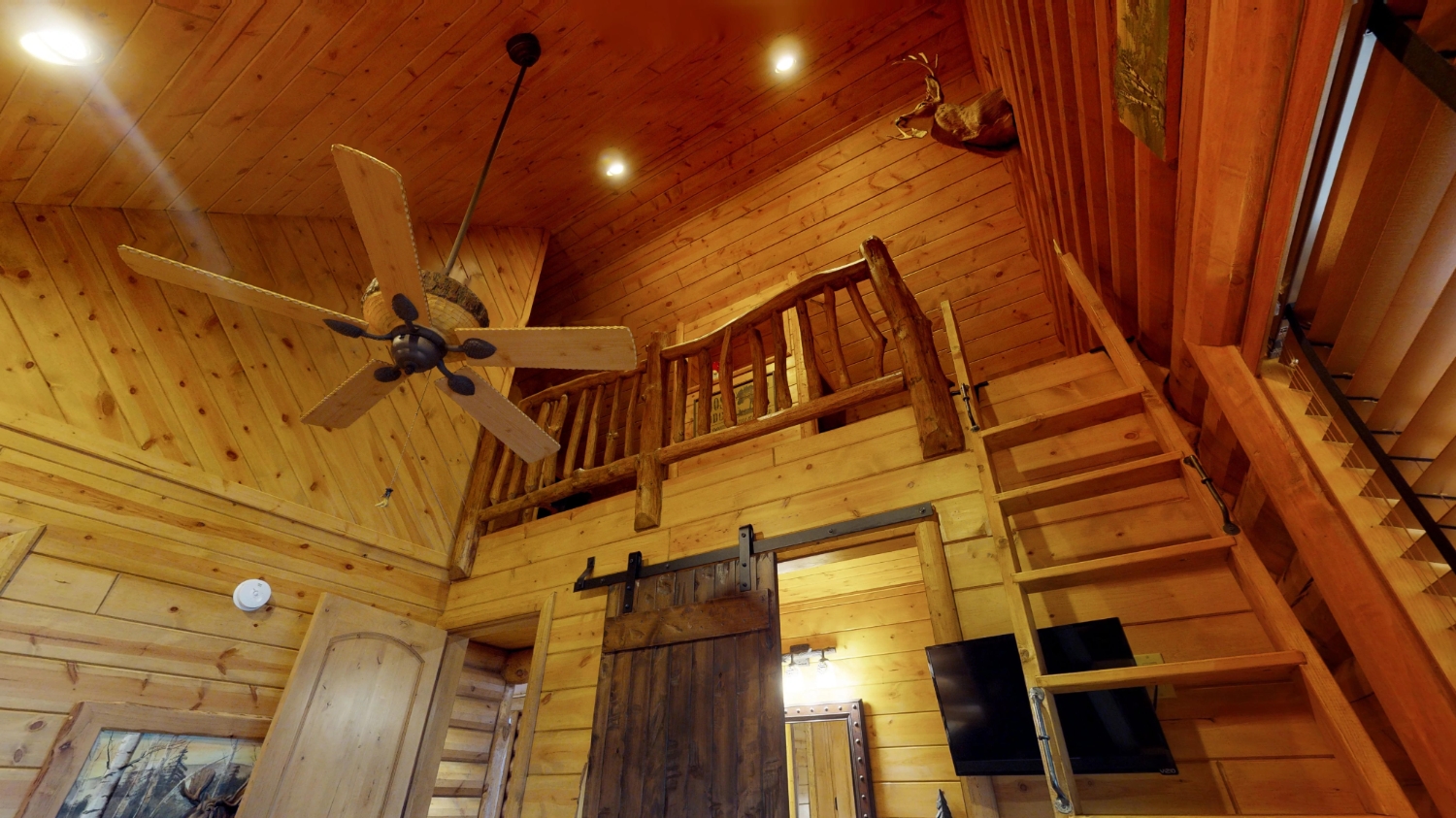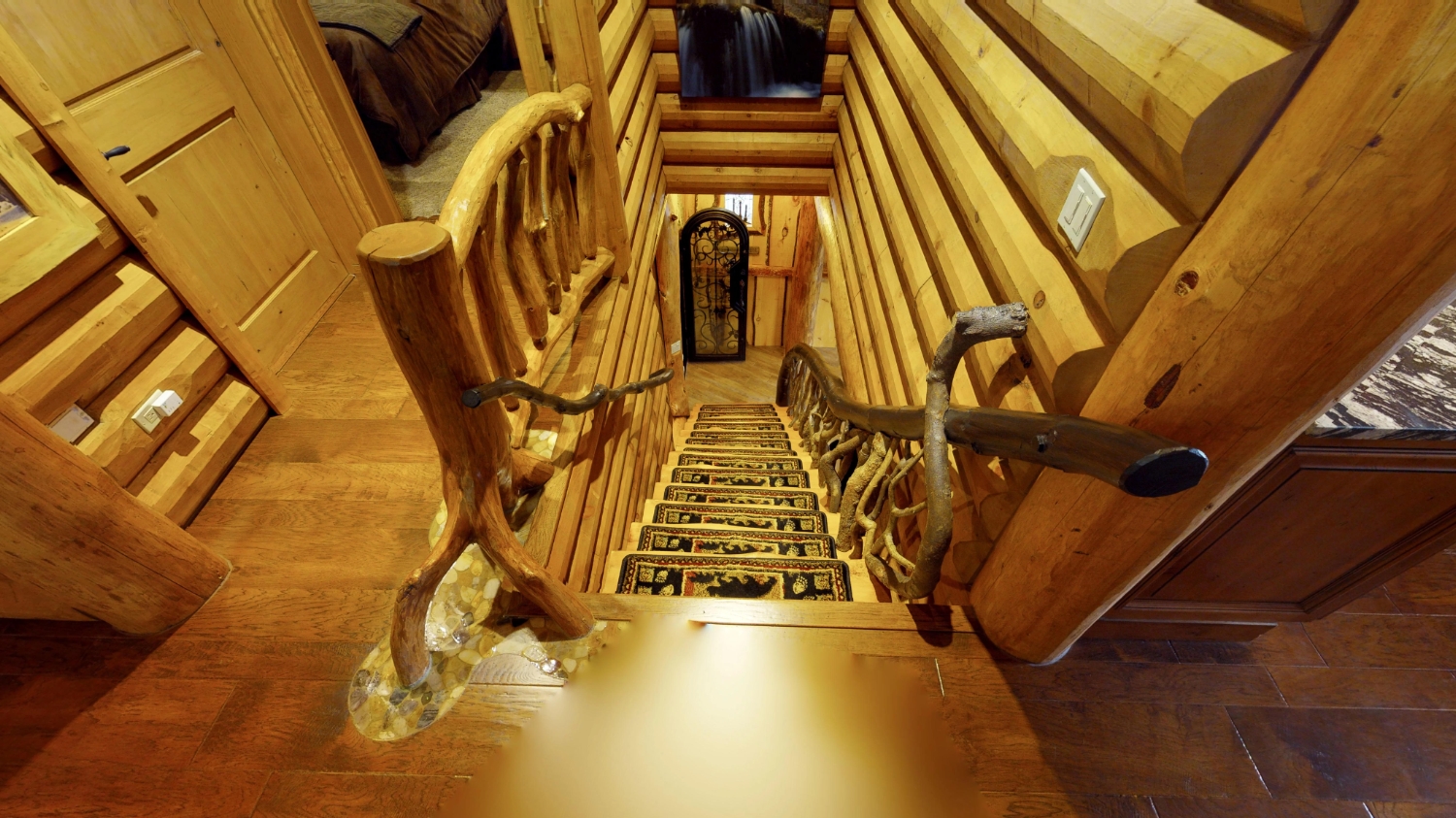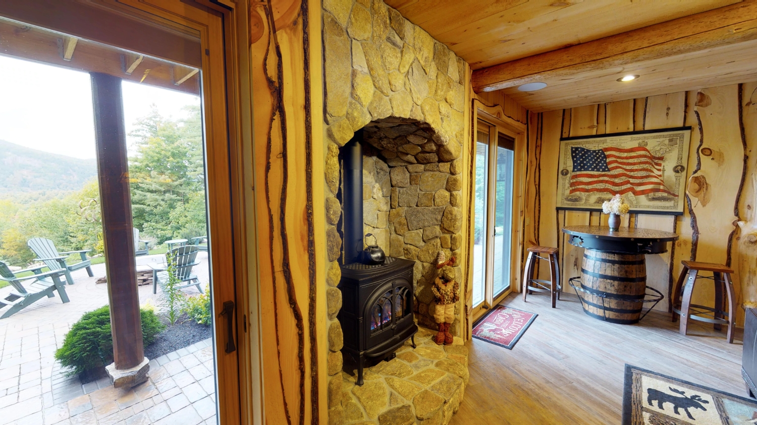 This stunning Custom South Carolina 2310AR is perched on a hillside with a view of the nearby mountains. When coming up the driveway you are given an amazing view of this majestic log home. Inside you see a number of wall types. It is a buffet of visuals for the eyes.