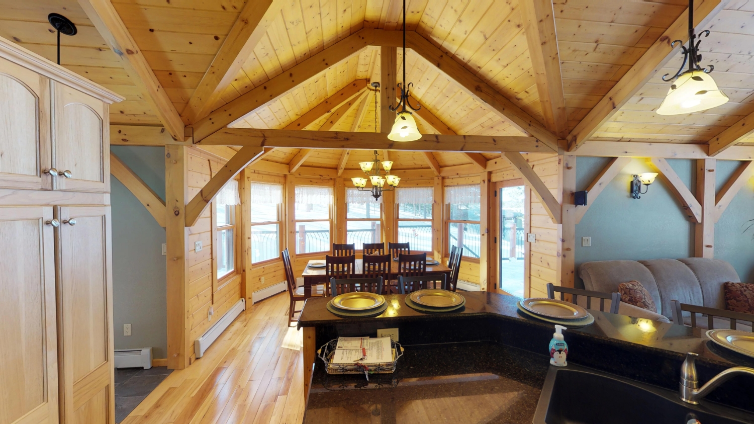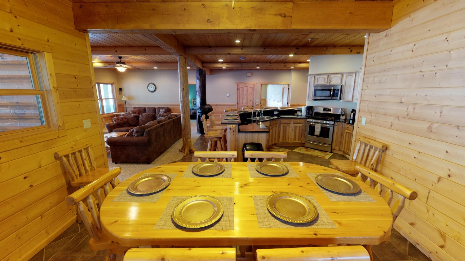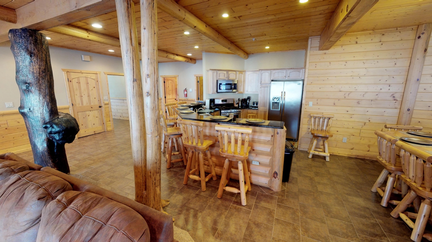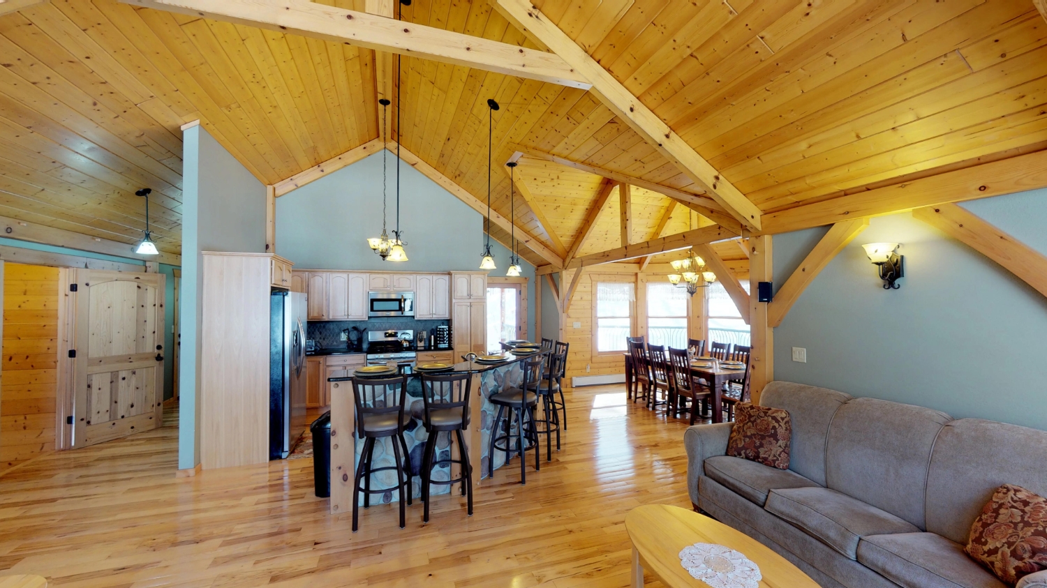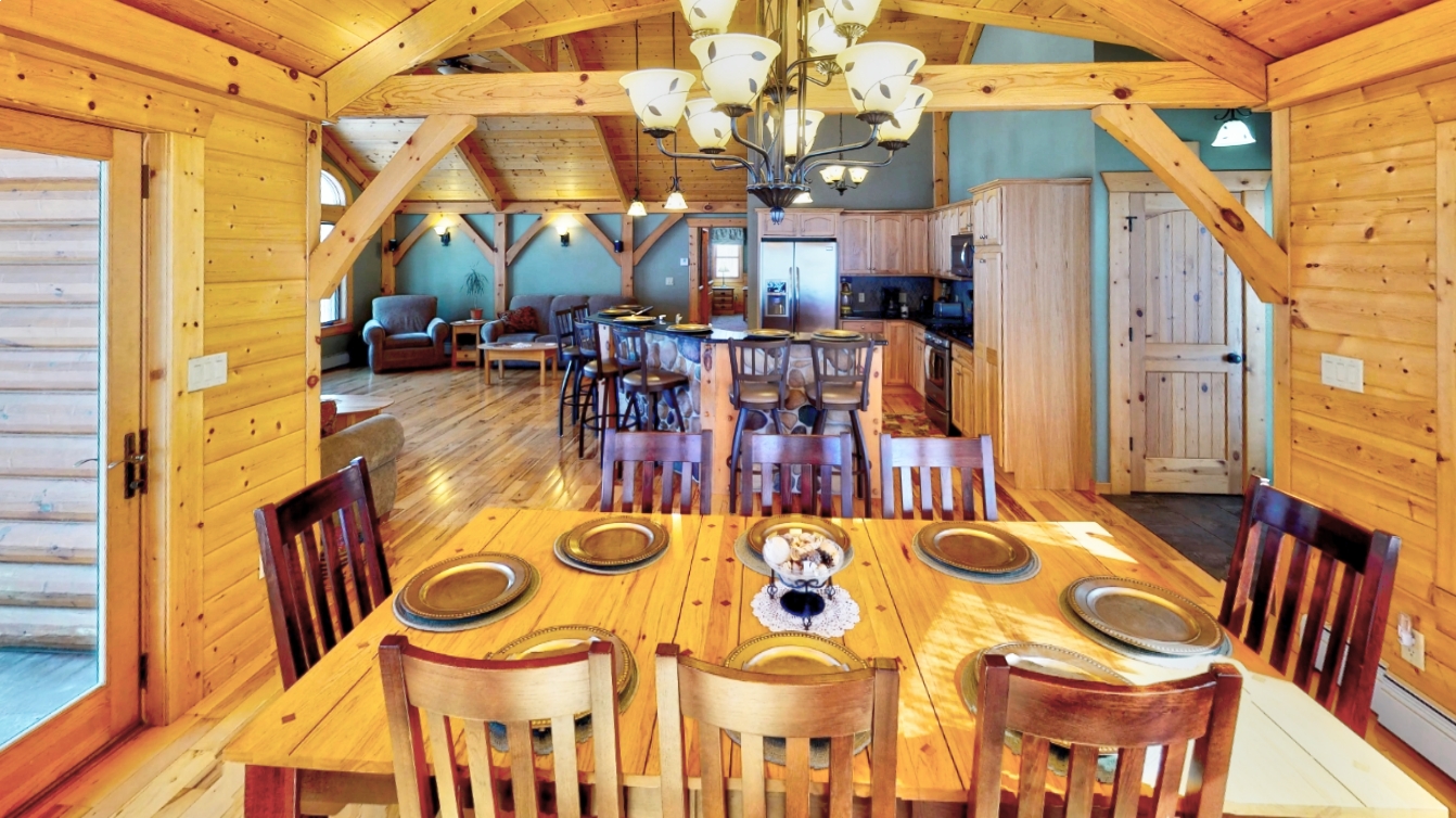 This log Hybrid Timber Frame log home has a lot of open space and yet still has a number of places that you can go to have your own space. It even has a mini loft hideaway. The octagon dining areas offer a breath taking view while pouring daylight into the home. The master suite walk-in closet has an enormous amount of space. It's a room of its own. This home is ideal for having guests and hosting large family events.