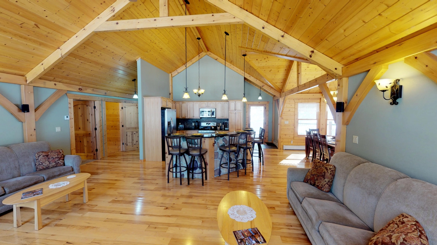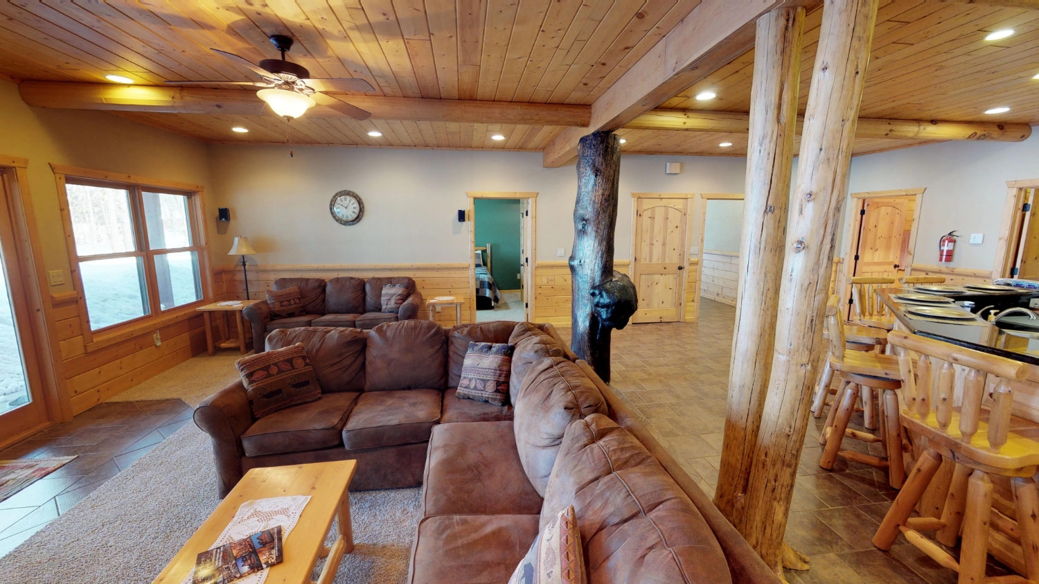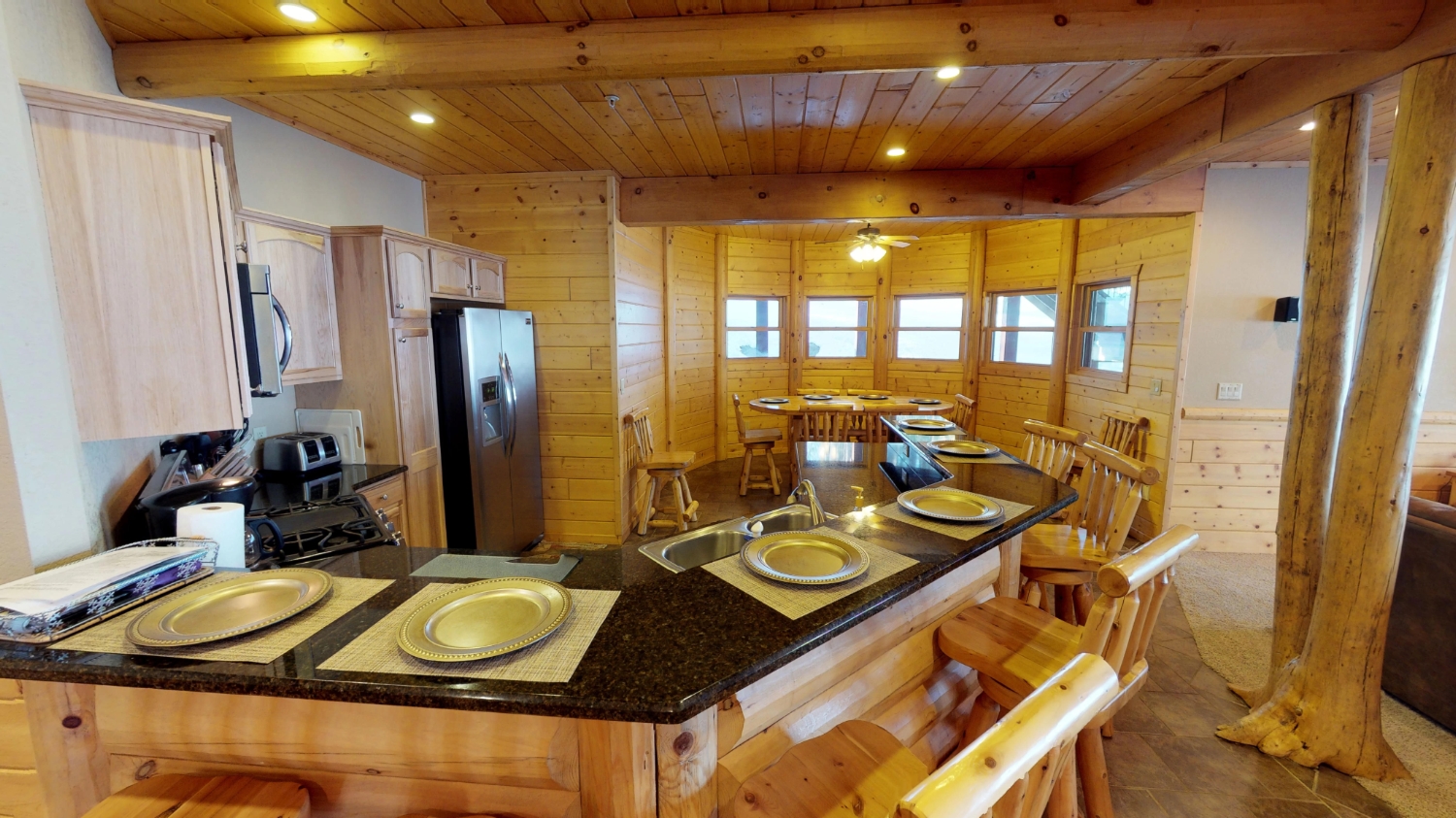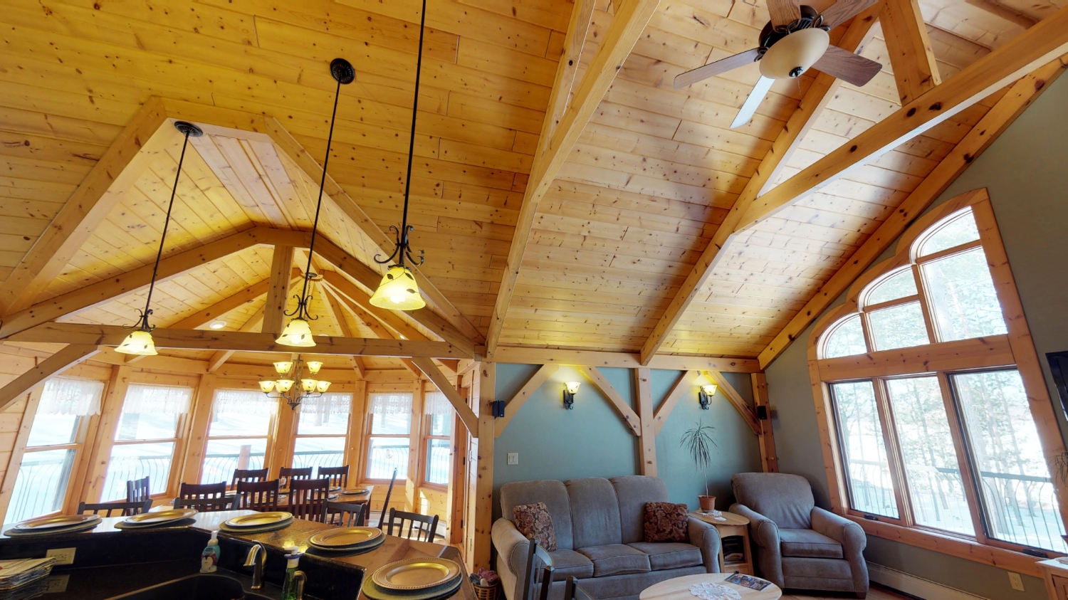 This log Hybrid Timber Frame log home has a lot of open space and yet still has a number of places that you can go to have your own space. It even has a mini loft hideaway. The octagon dining areas offer a breath taking view while pouring daylight into the home. The master suite walk-in closet has an enormous amount of space. It's a room of its own. This home is ideal for having guests and hosting large family events.