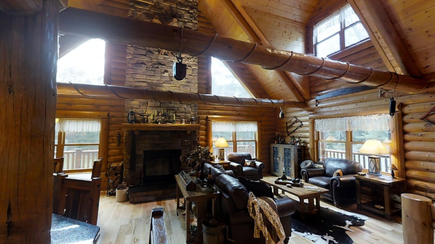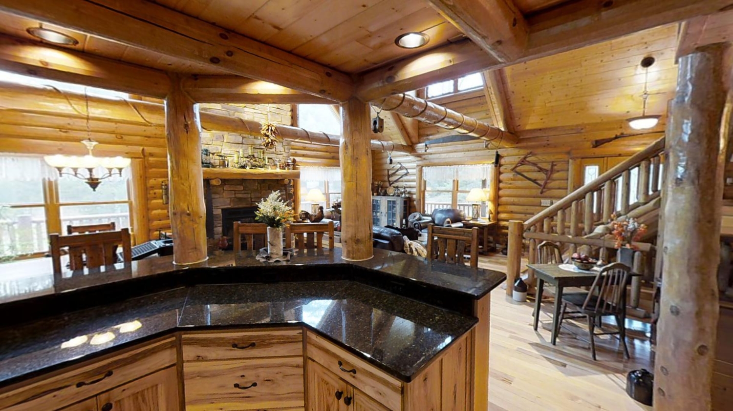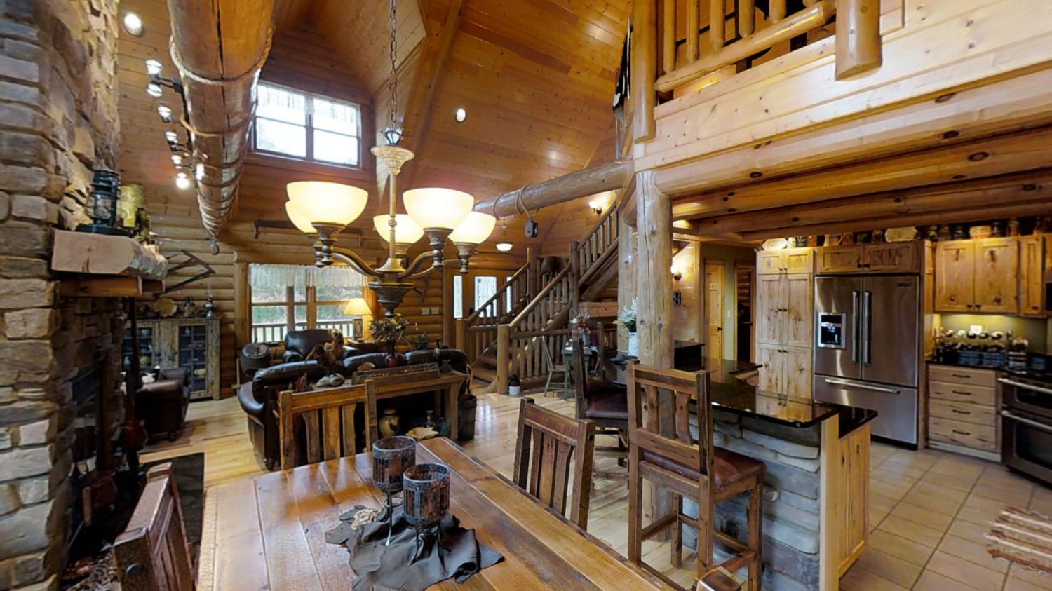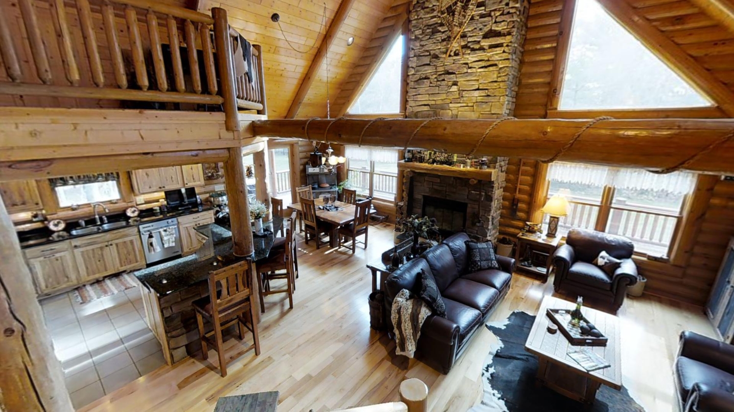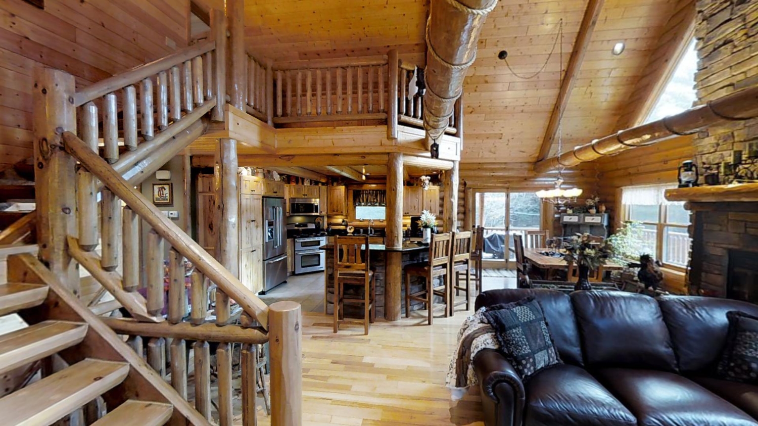 This ranch style home is based on our Lofted Log 1969AL floor plan. This custom version of the Lofted Log 1969AL has a very open and spacious feel. It has high vaulted ceilings in the great room with an overlooking loft area. The home owner's rustic decor preference lends itself well to a log home while using modern appliances and having an impressive "man cave" with a large projection theater screen.