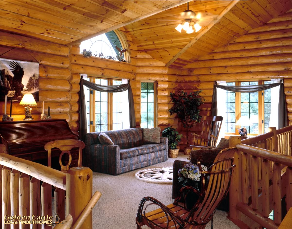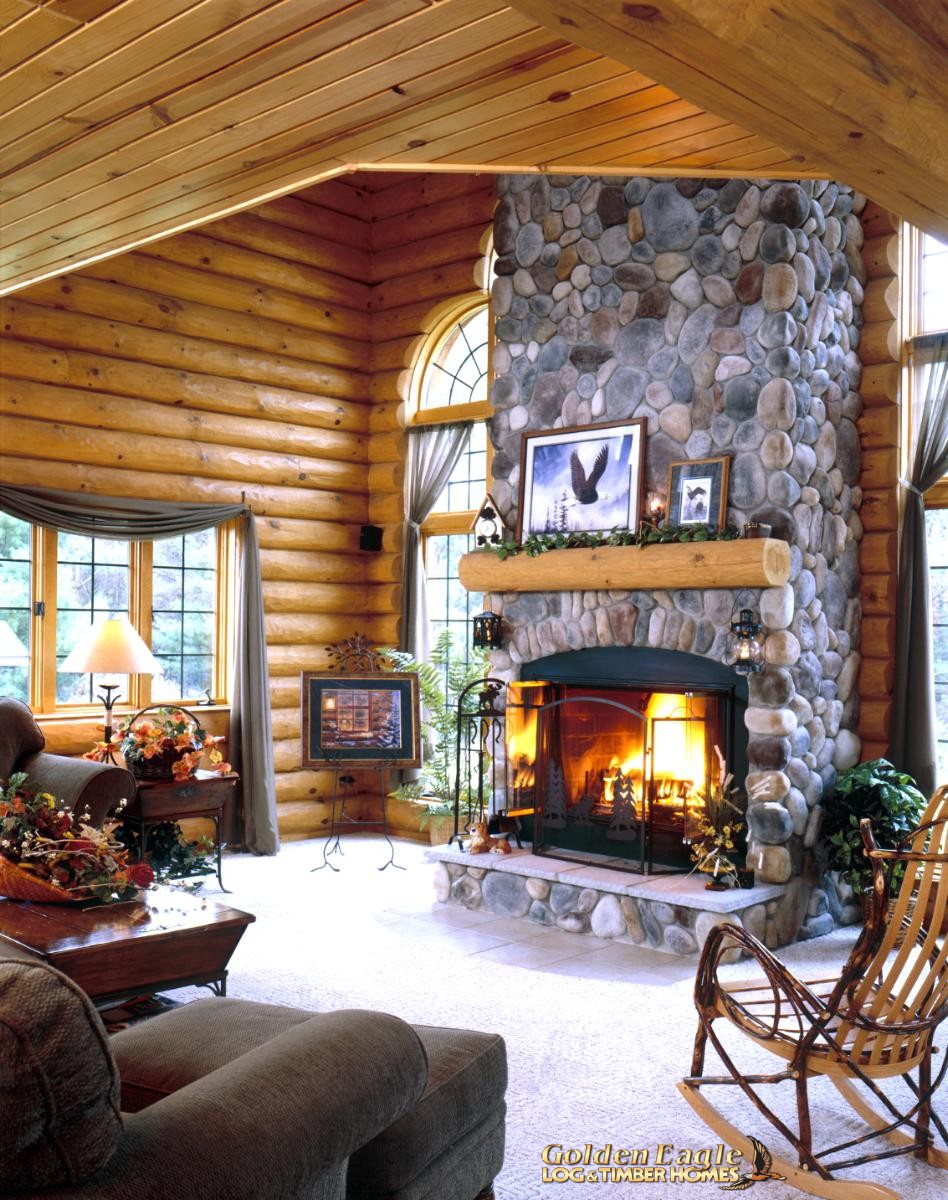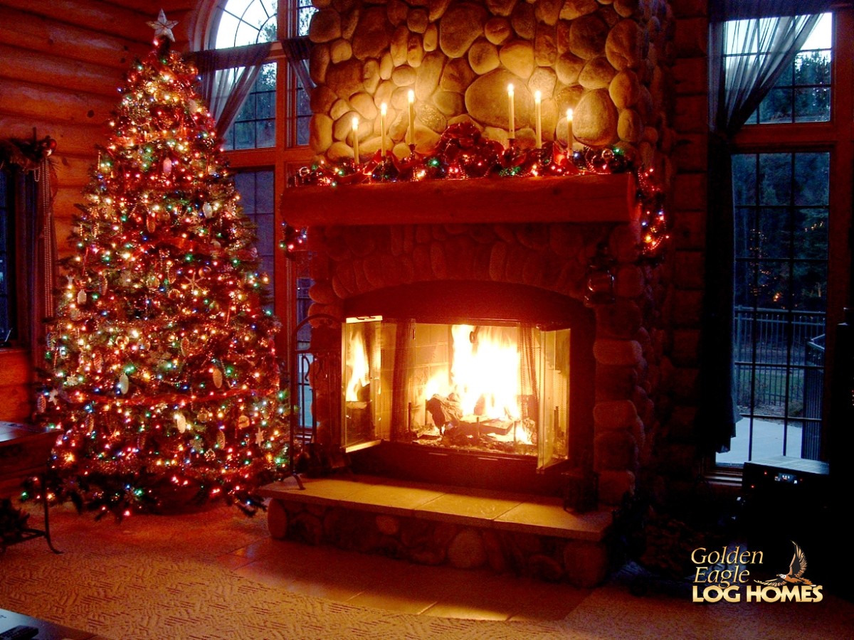 Christmas Tree & Fireplace in a Log Home Livingroom
