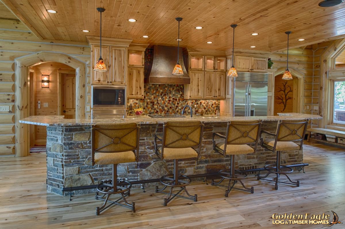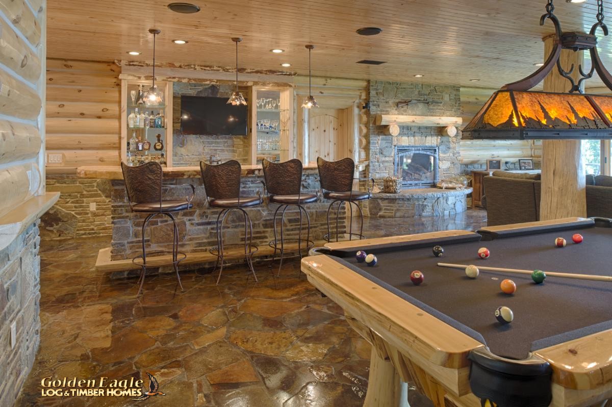Some of the key features that are seen consistently throughout the Lakehouse plan are the hints of stone that are seen on the exterior of the patio overhangs and inside on the two fireplaces, the downstairs bar area and on the custom stone floors in the bathrooms and in the basement.