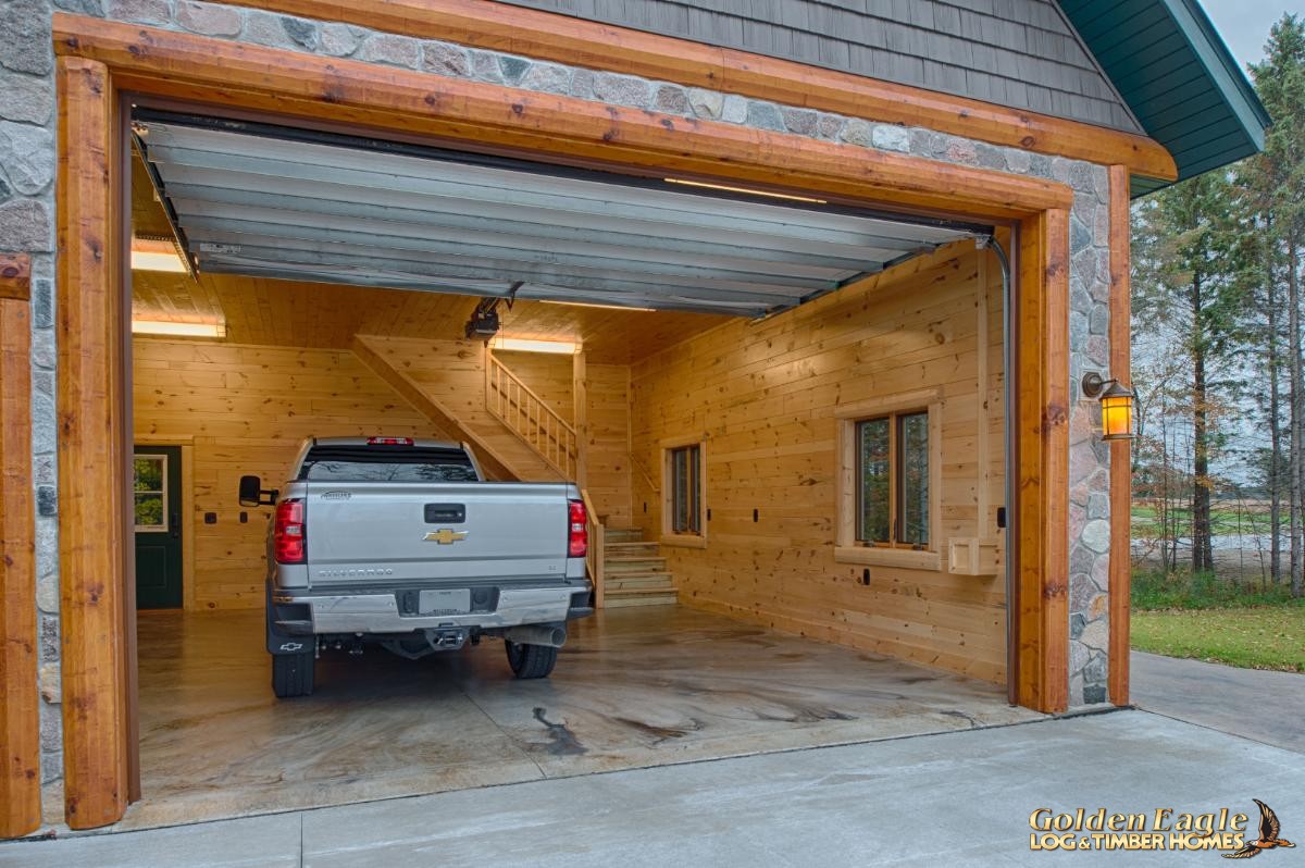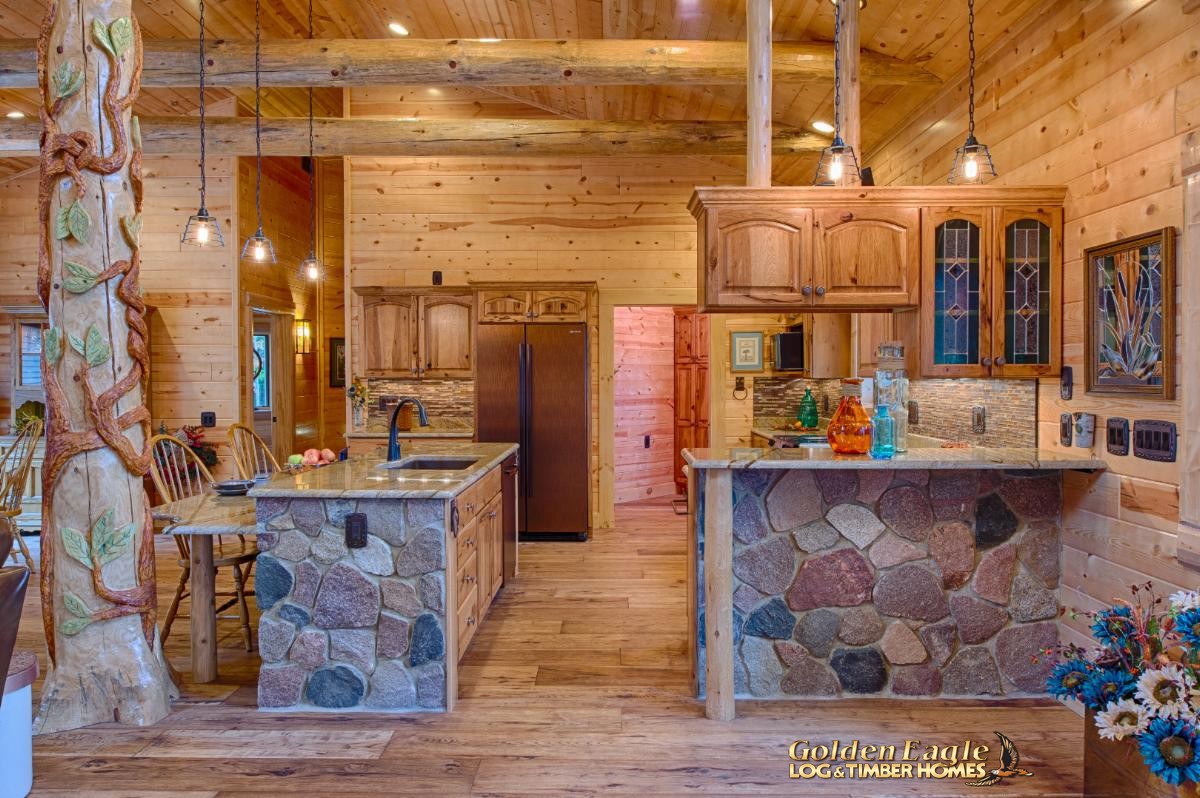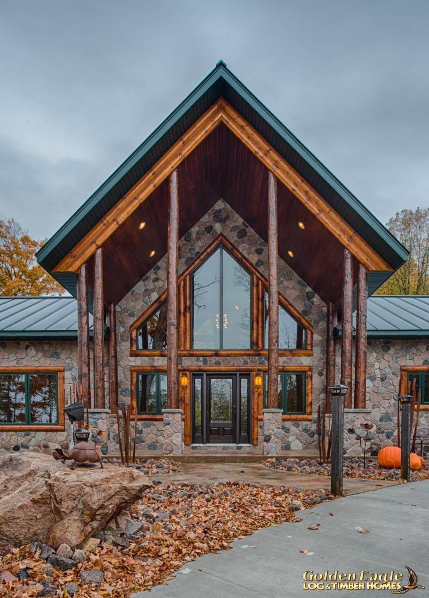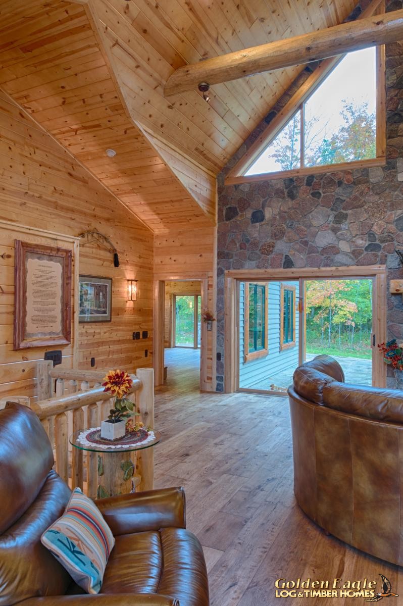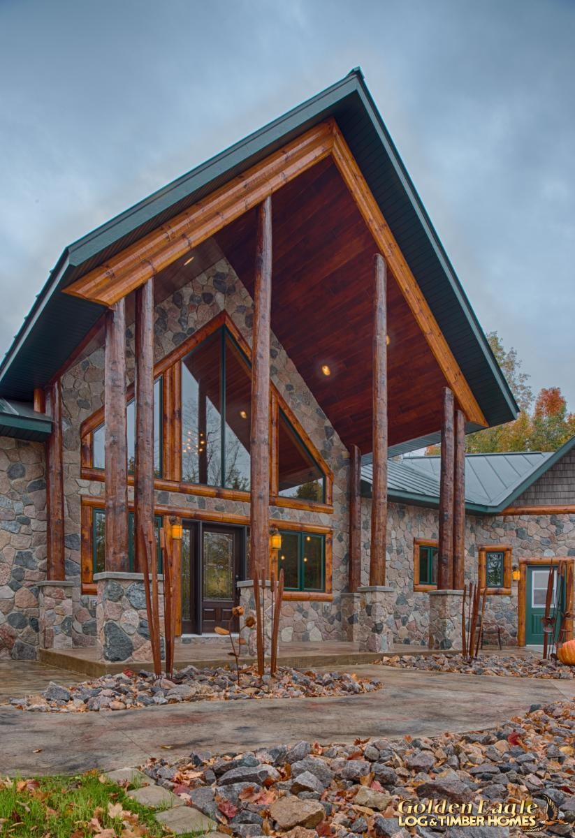 This hybrid log home features a lot of maintenance free stone outside the home while showcasing the log & wood components inside the home.