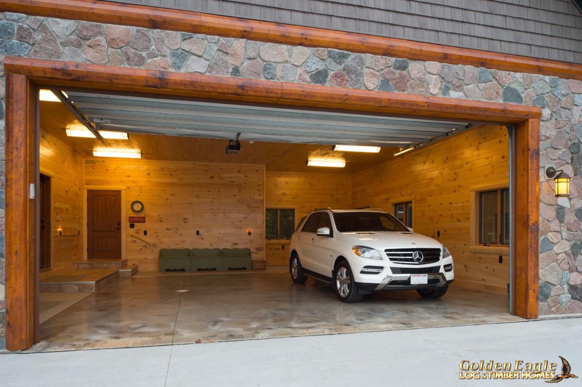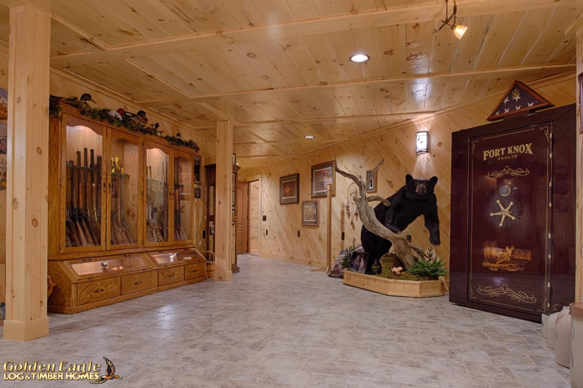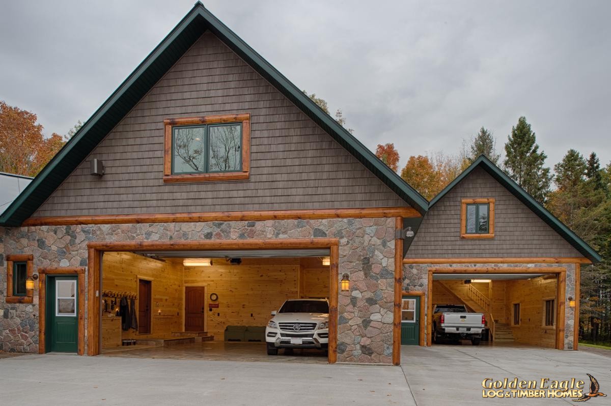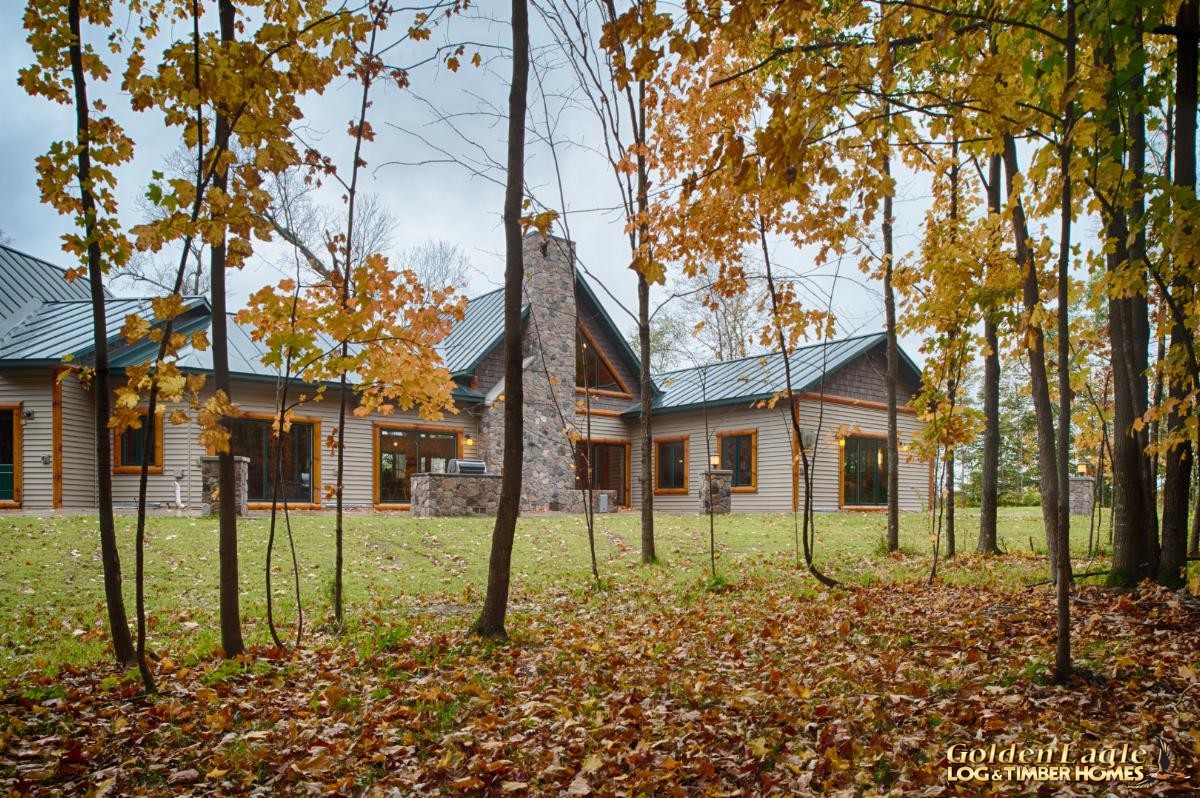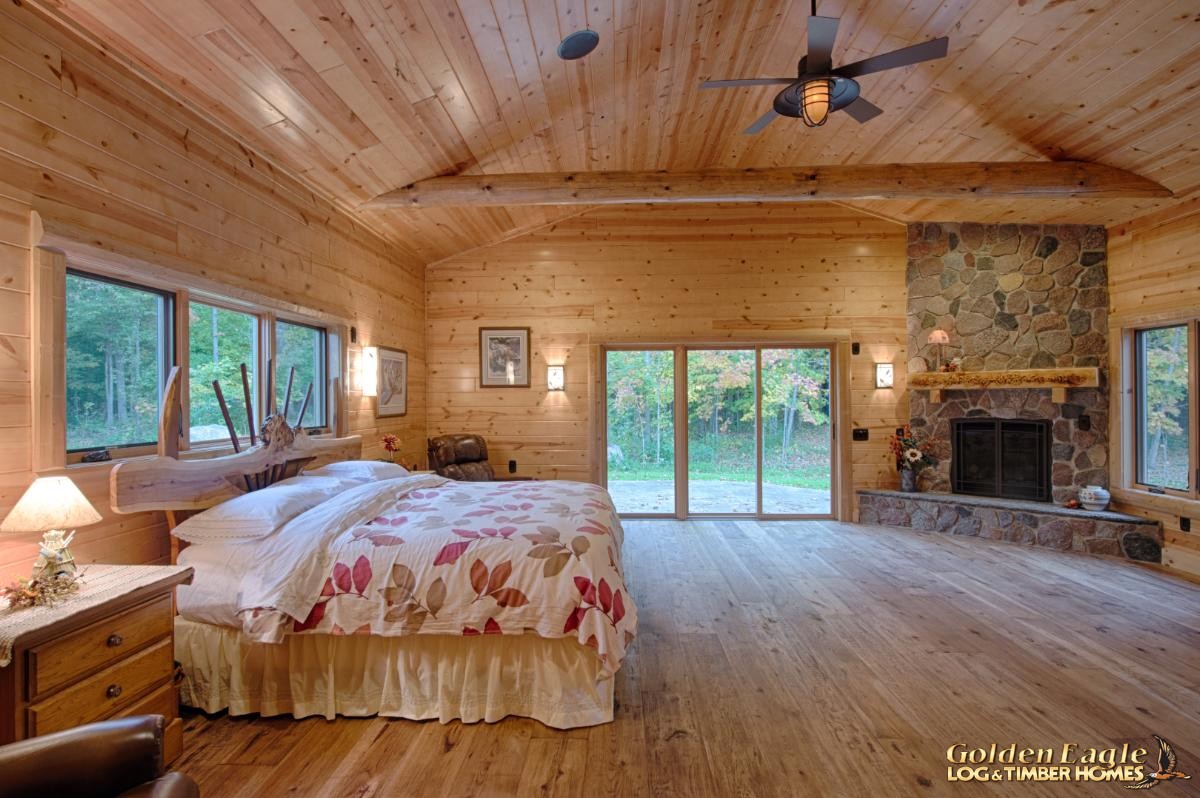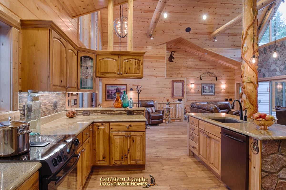 This hybrid log home features a lot of maintenance free stone outside the home while showcasing the log & wood components inside the home.