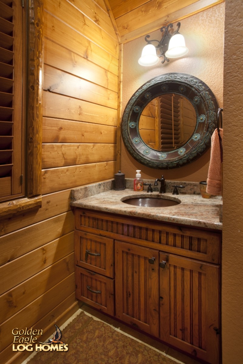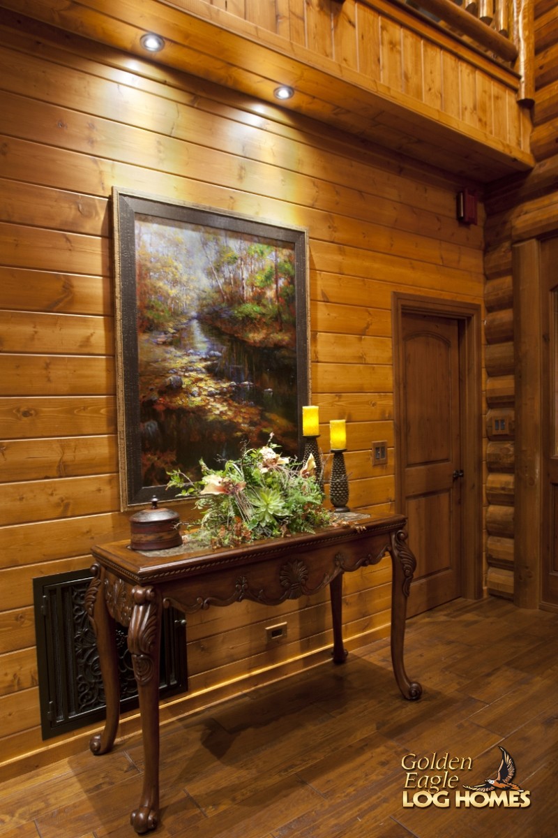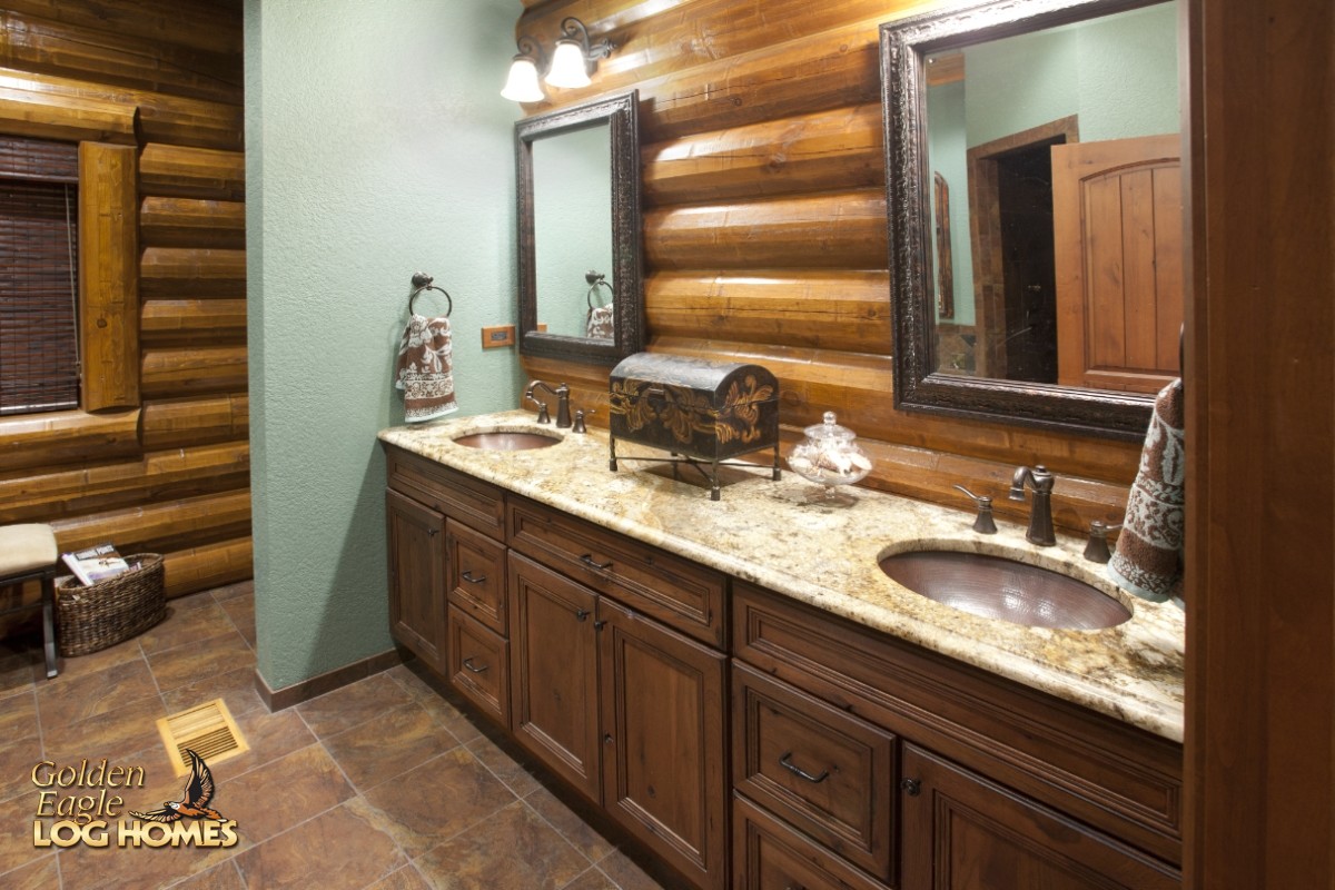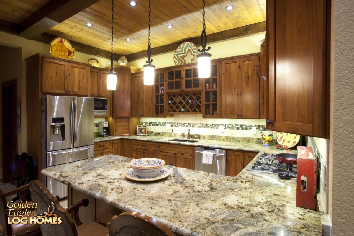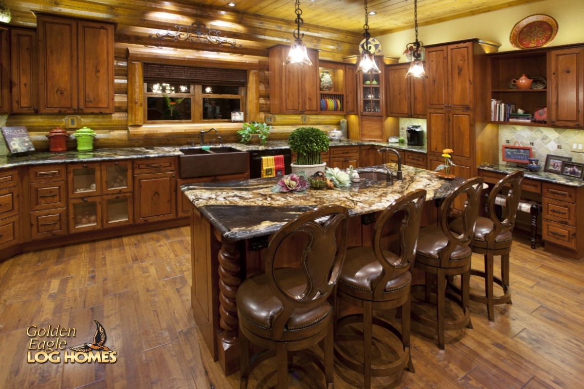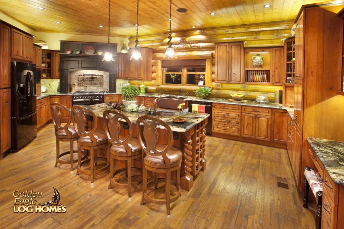 Throughout the home the square timbers and round logs work together to create a grand yet, inviting hybrid feel. The first floor is spacious with 2,187 sq. ft. Each of the rooms are oversized, including the first-floor master suite, two dining areas and the kitchen. With an angled garage like this home's, it not only creates architectural curb appeal, but also an opportunity for a unique kitchen layout. This kitchen is nothing short of luxurious with a multitude of upper and lower cabinets that offer plenty of storage, along with a nearby pantry.