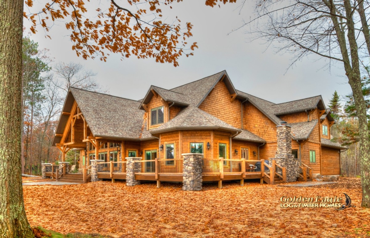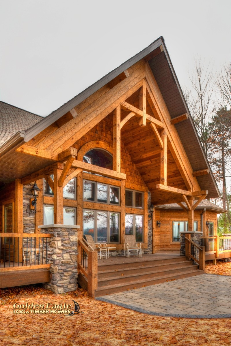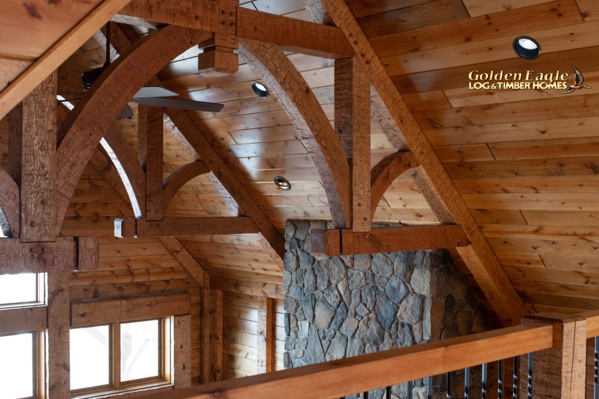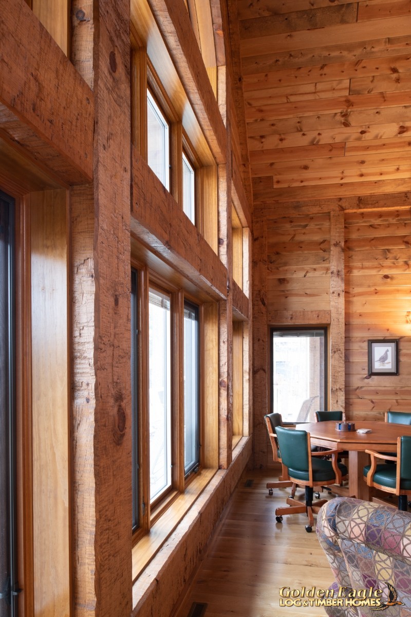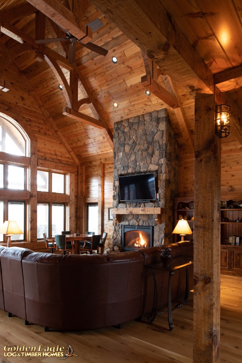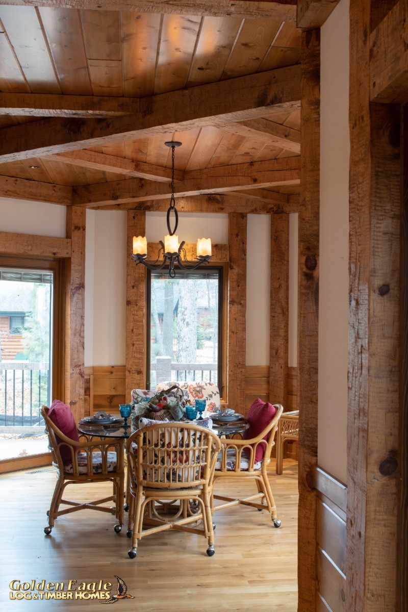 This exposed timber beam home was built in northern Wisconsin. The large vacation home was built to accommodate 3 generations of family members all at once. A truly amazing family getaway.