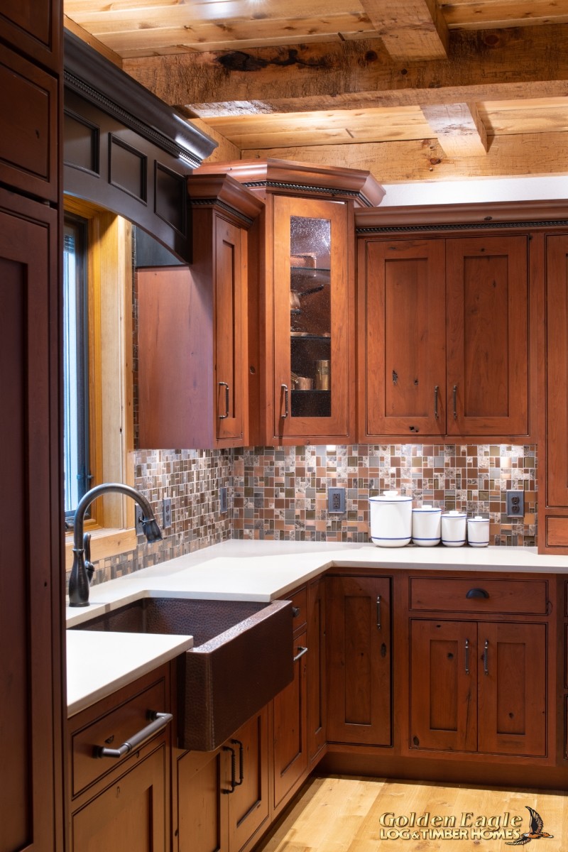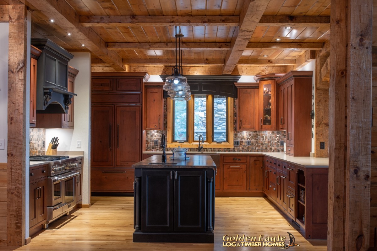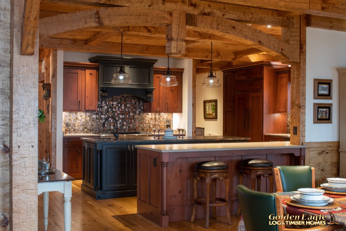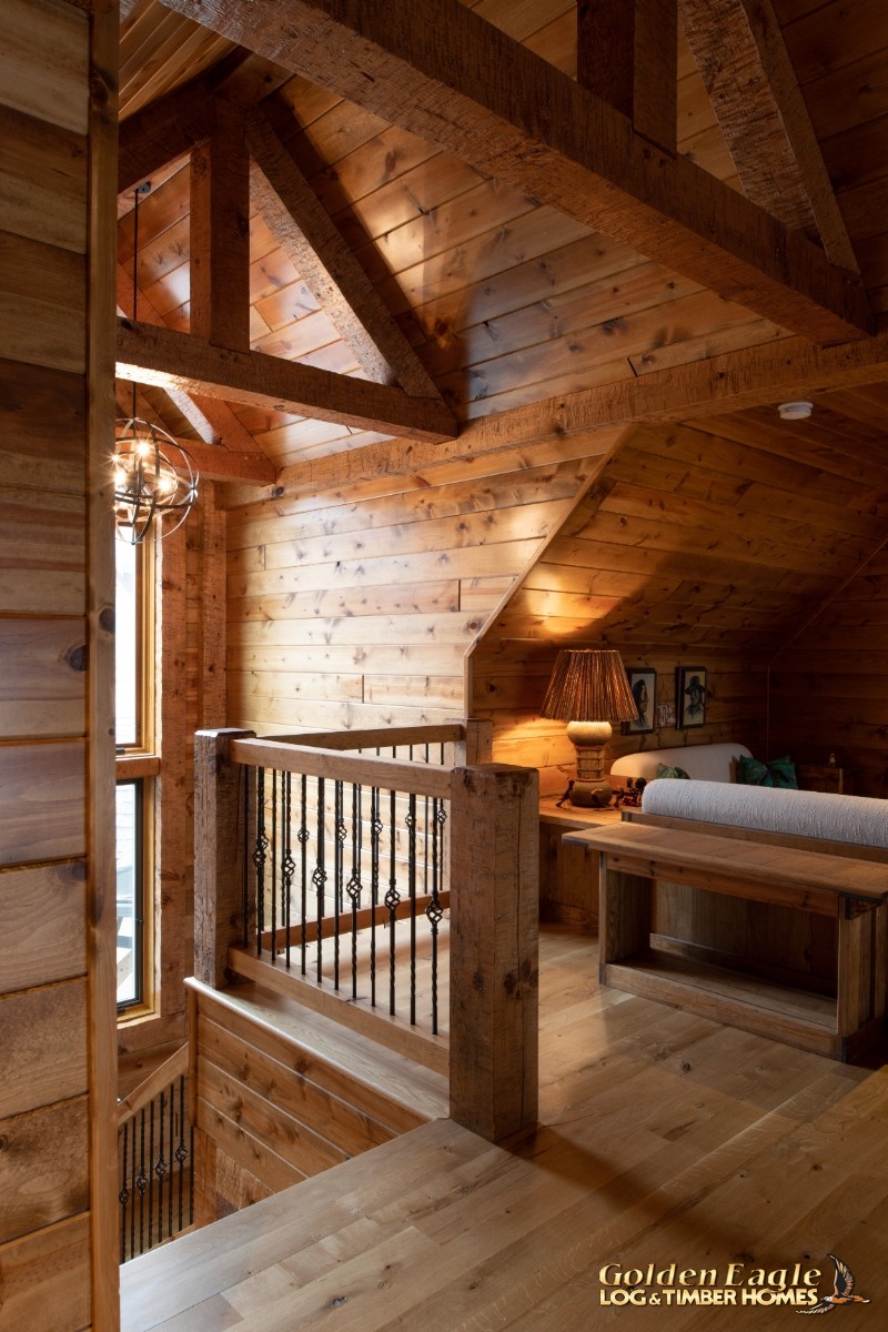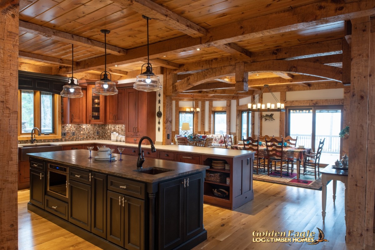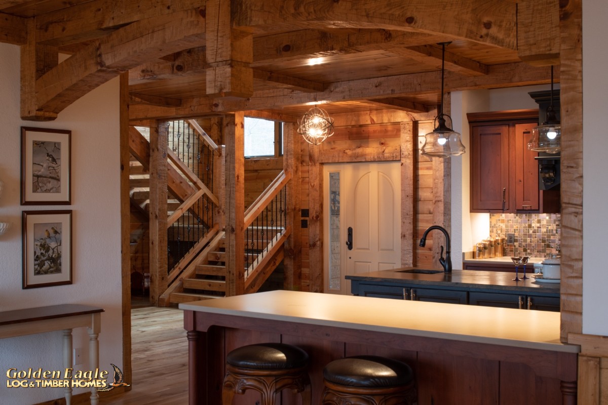 This exposed timber beam home was built in northern Wisconsin. The large vacation home was built to accommodate 3 generations of family members all at once. A truly amazing family getaway.