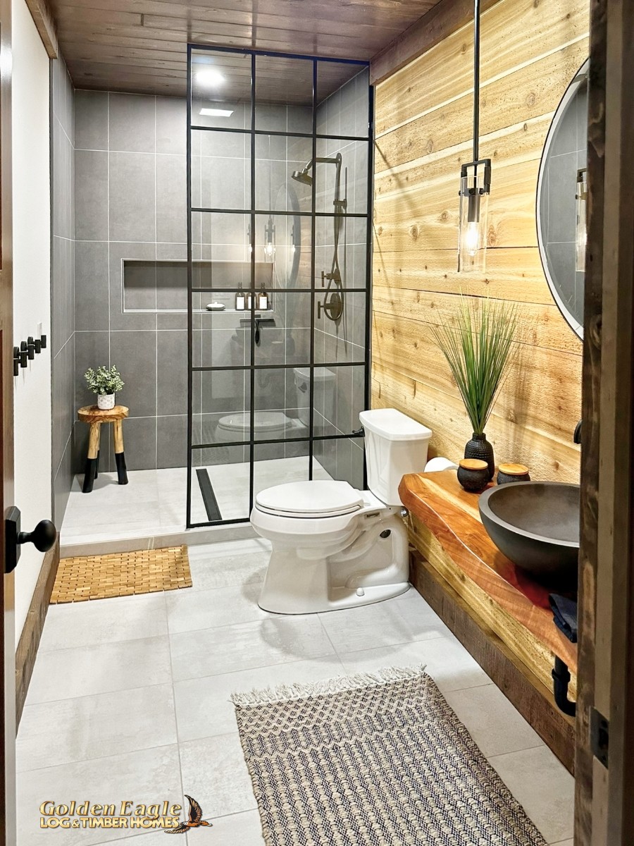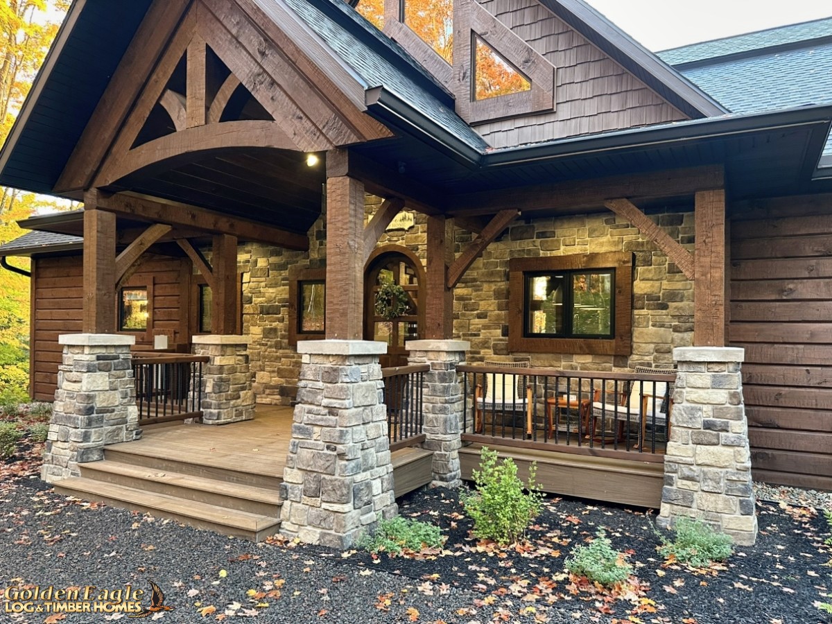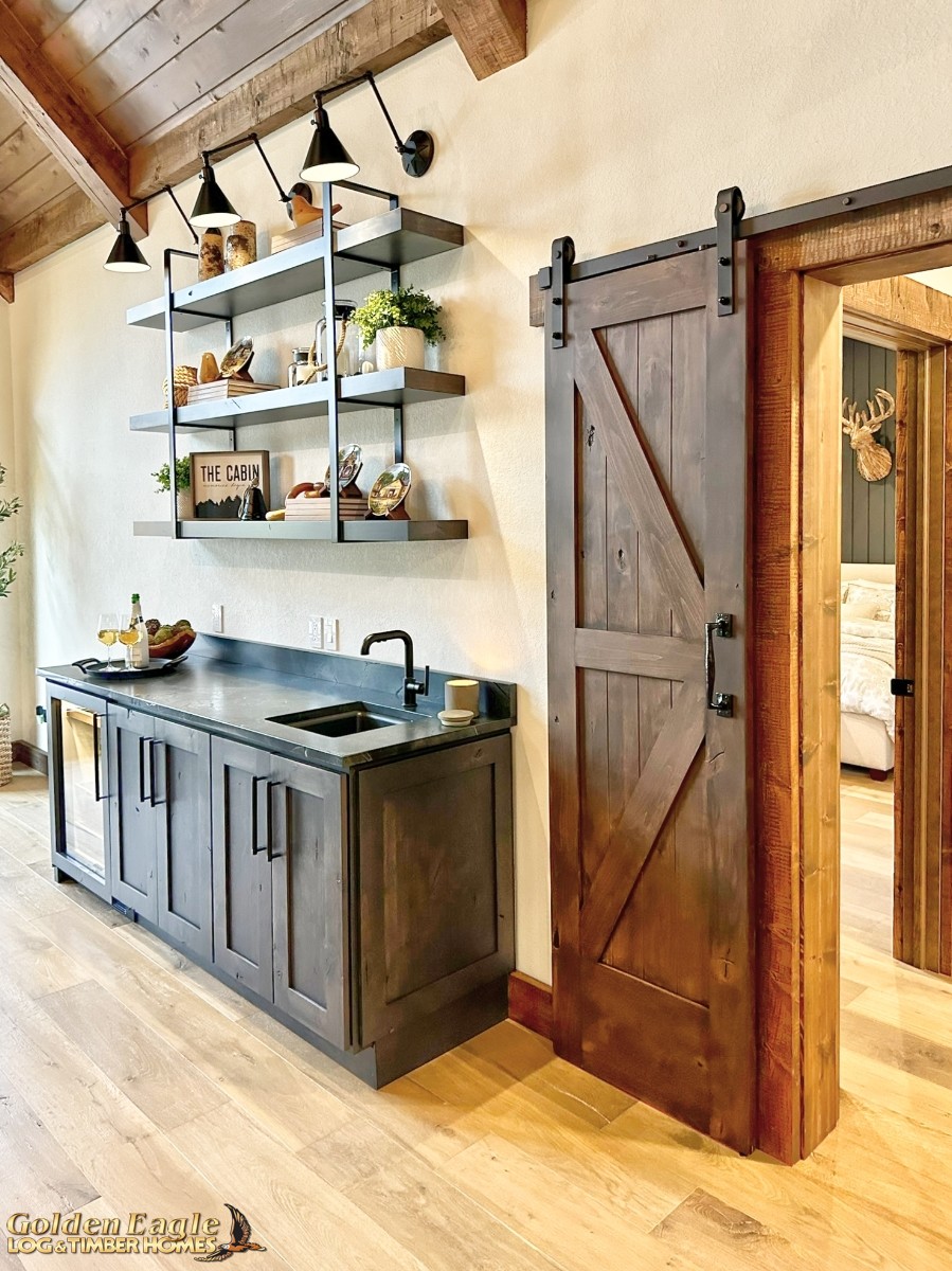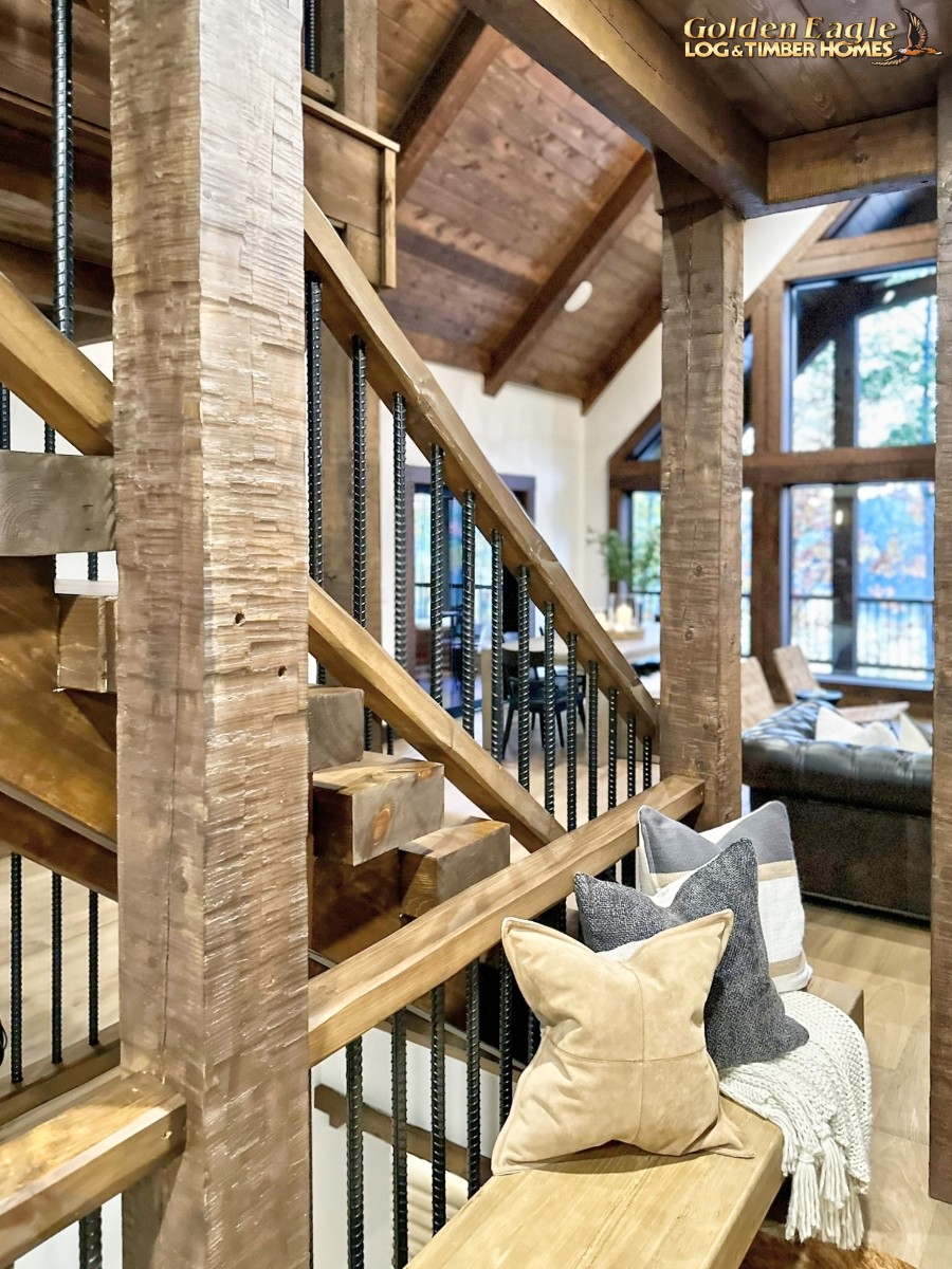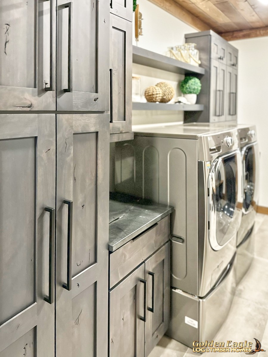 This home is one of our most highly anticipated floor plans this year. It features square timbers and has many modern amenities. There is ample use of rugged log materials as well as traditional drywall. This home has a perfect mix of both rustic and modern.