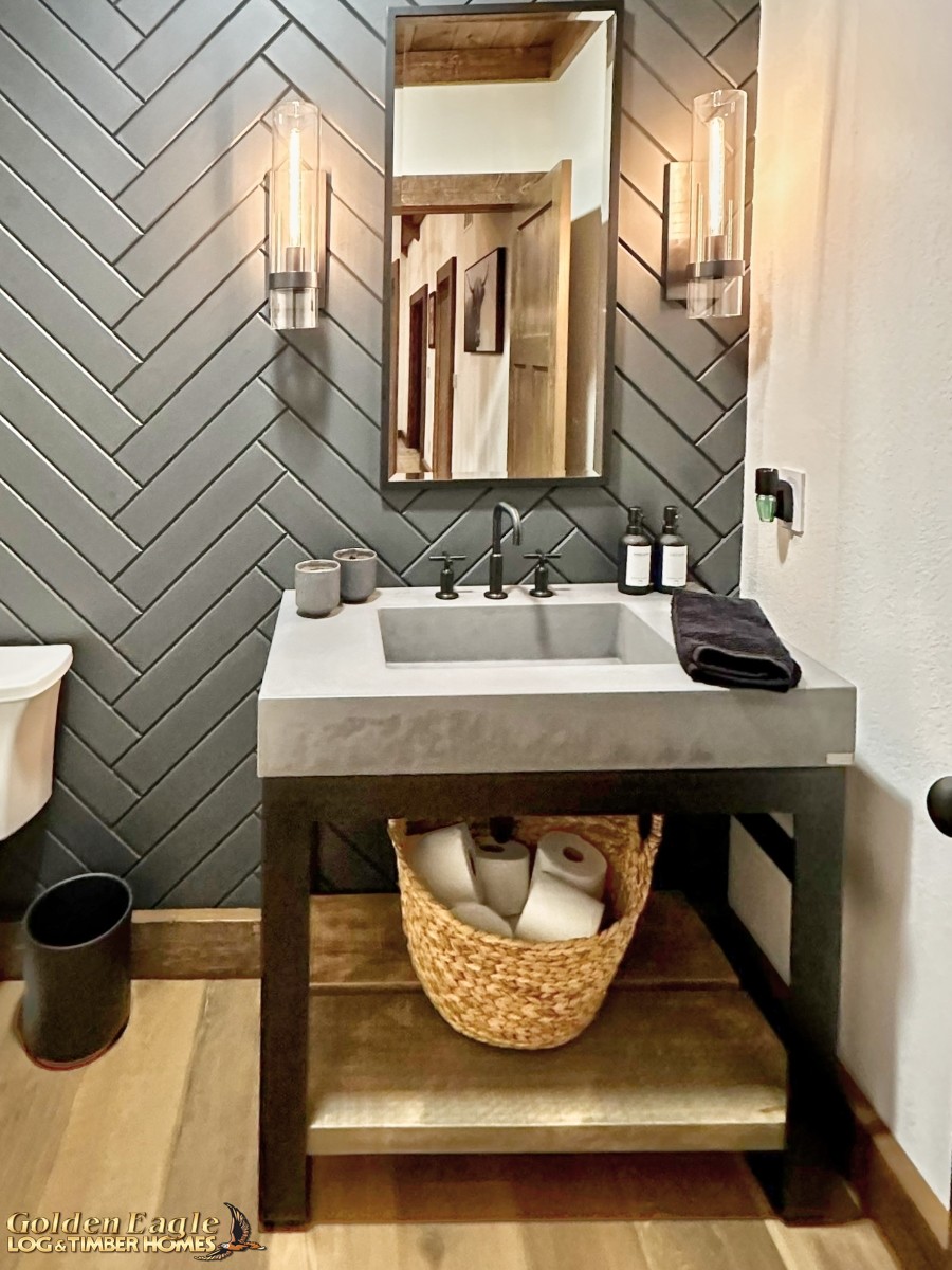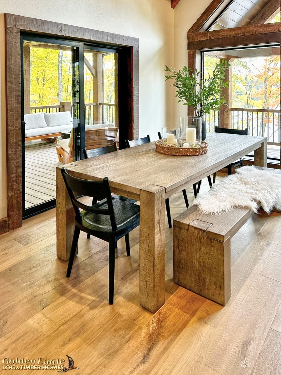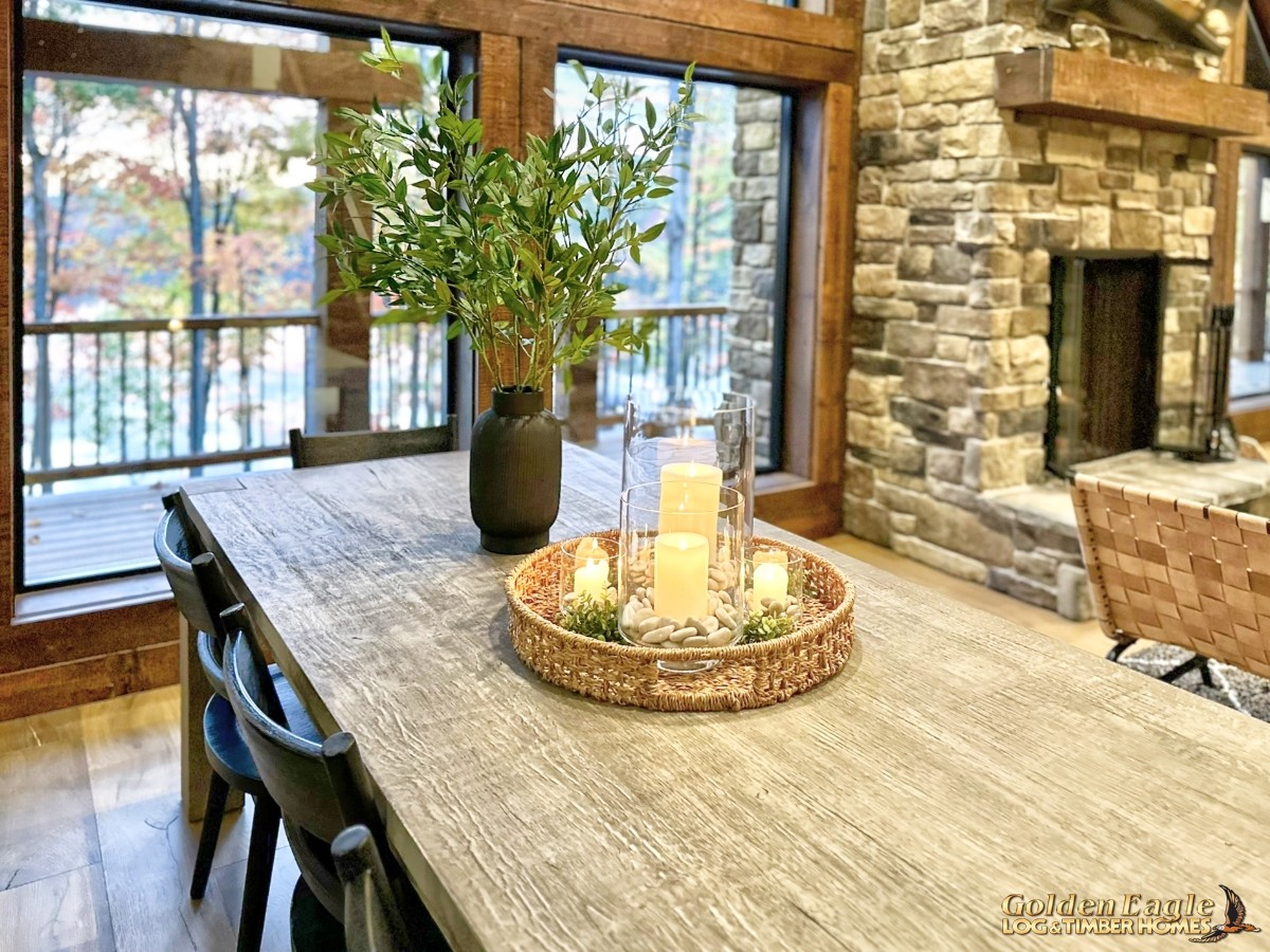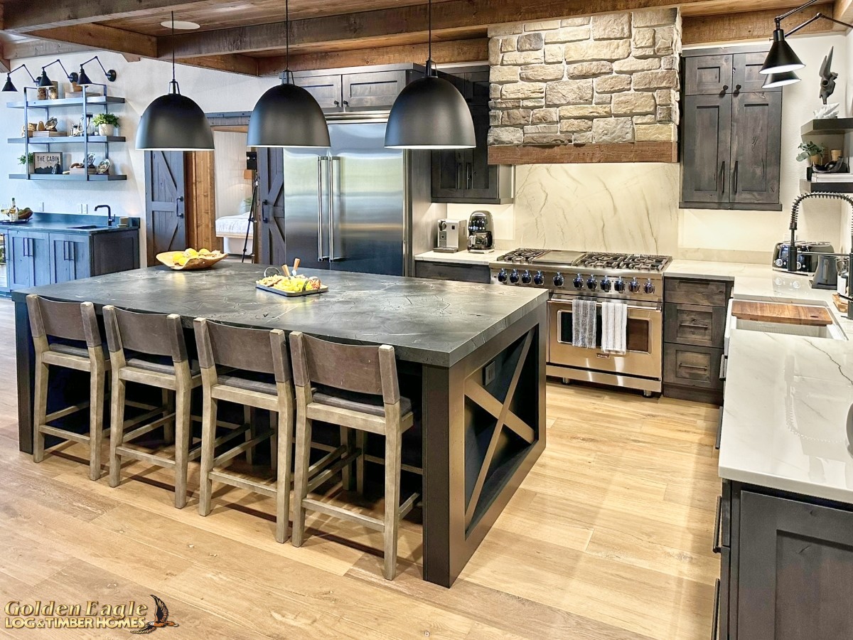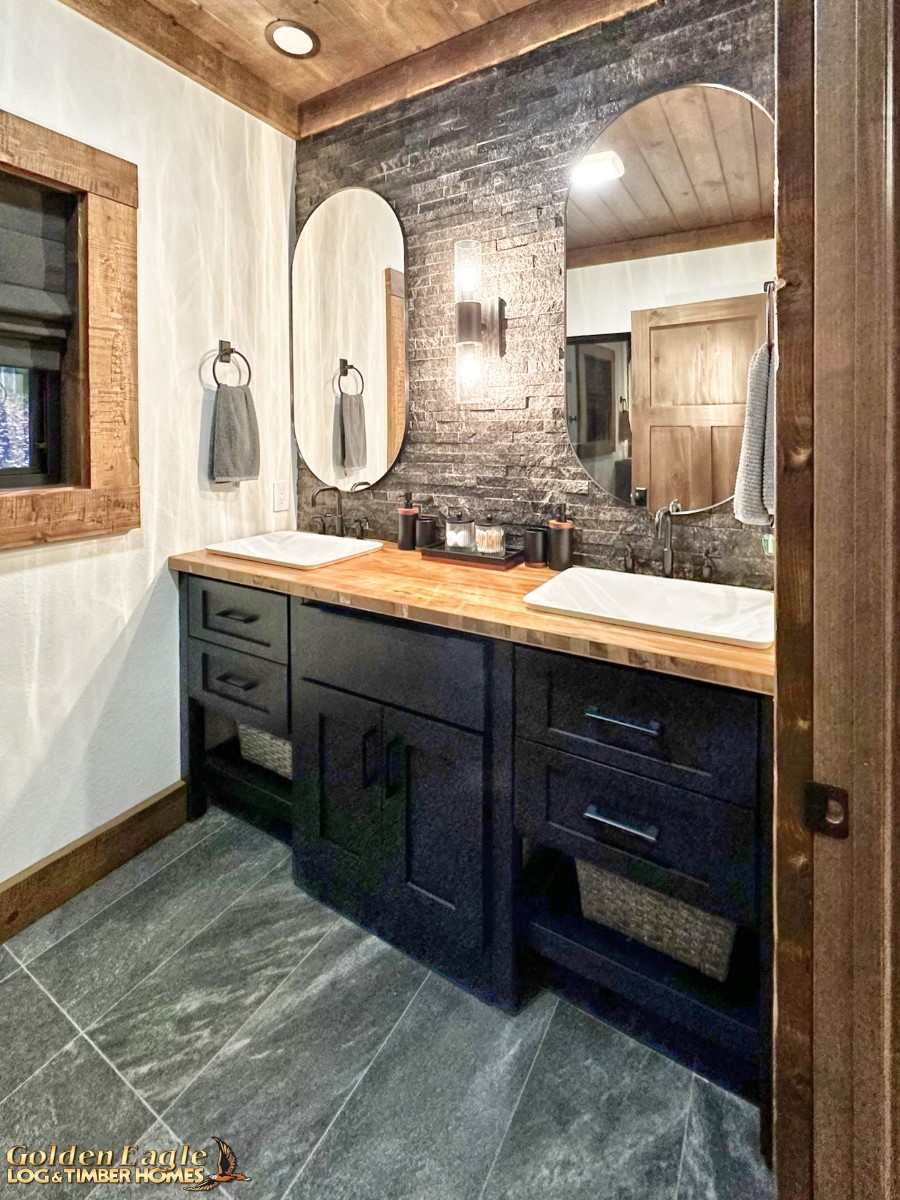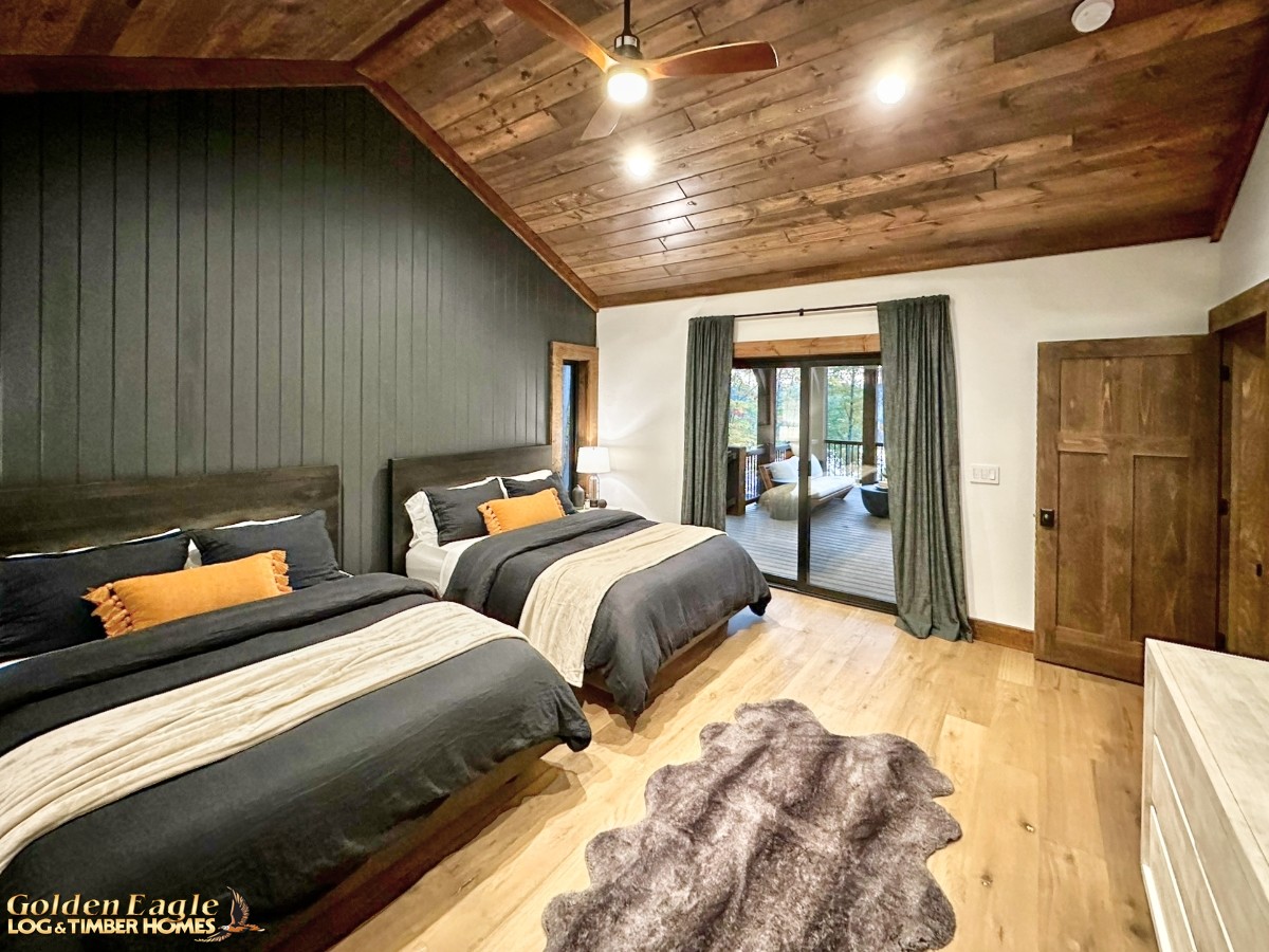 This home is one of our most highly anticipated floor plans this year. It features square timbers and has many modern amenities. There is ample use of rugged log materials as well as traditional drywall. This home has a perfect mix of both rustic and modern.
