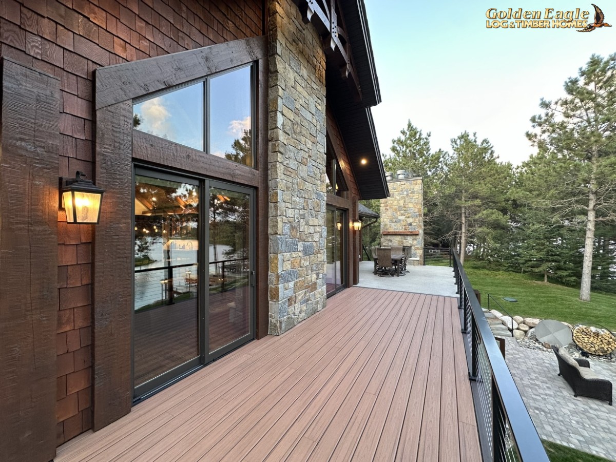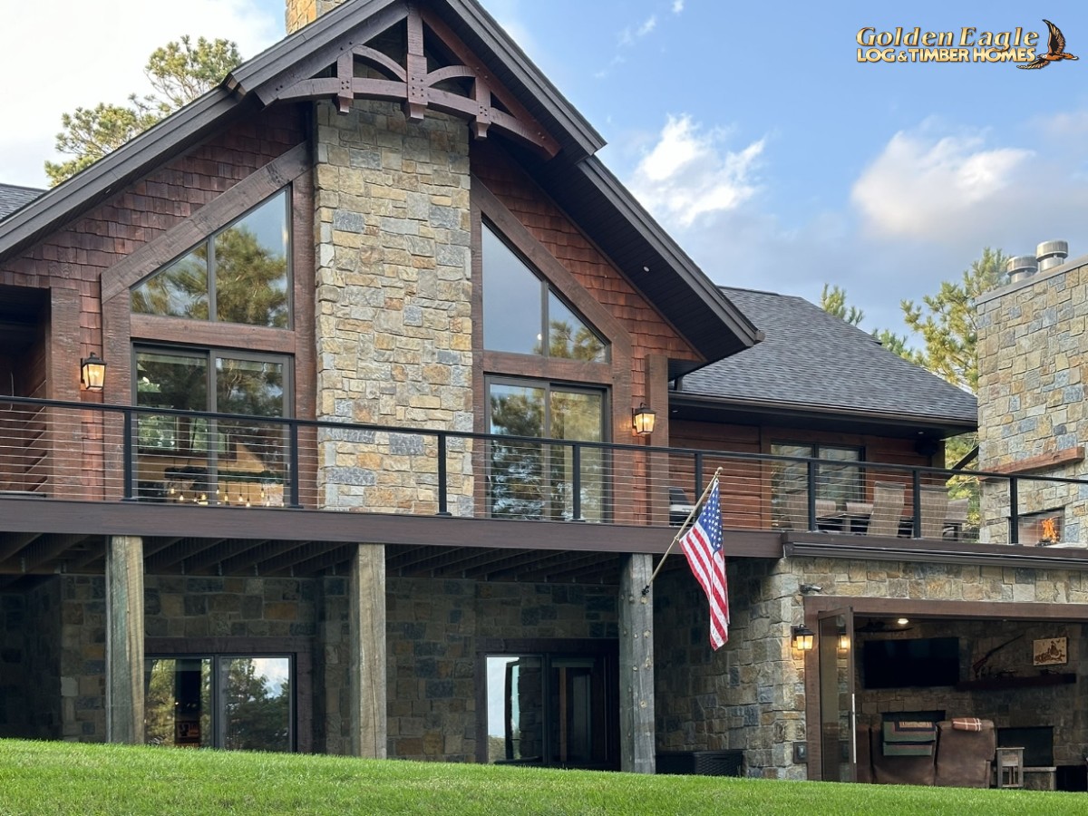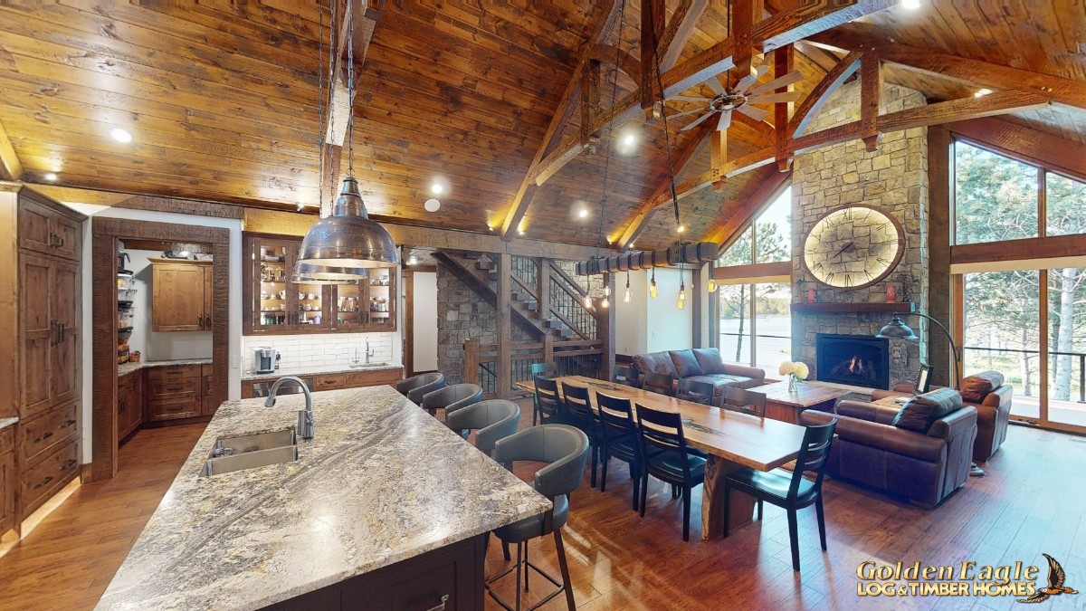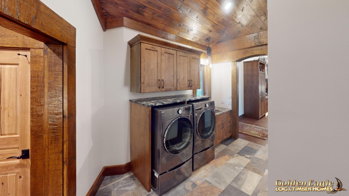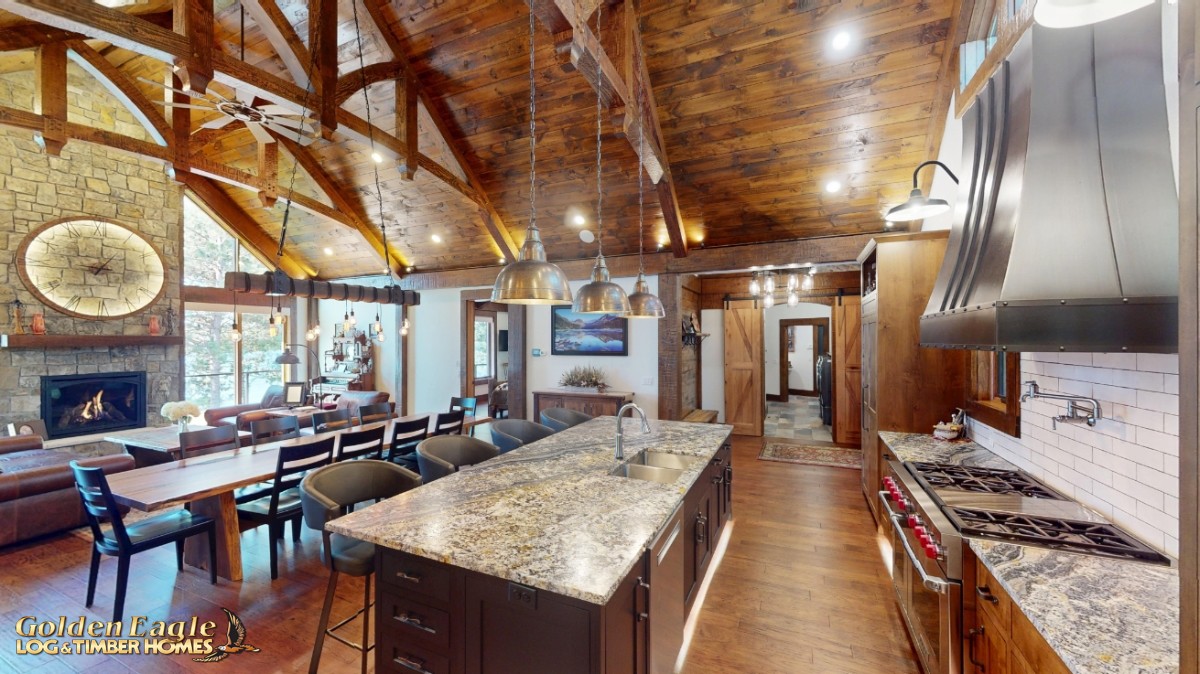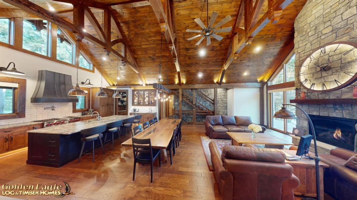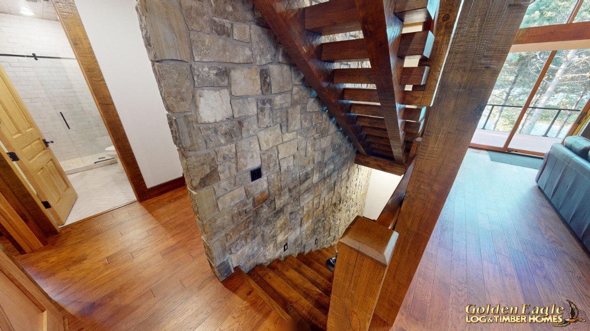 This custom timber frame home offers a thoughtfully designed floor plan with desirable first-floor conveniences, including a laundry room and a master bedroom. The master suite boasts a luxurious bathroom complete with a tiled shower, bathtub, double vanity, and a private toilet room. It also includes a generous walk-in closet and direct access to a deck from the bedroom.
