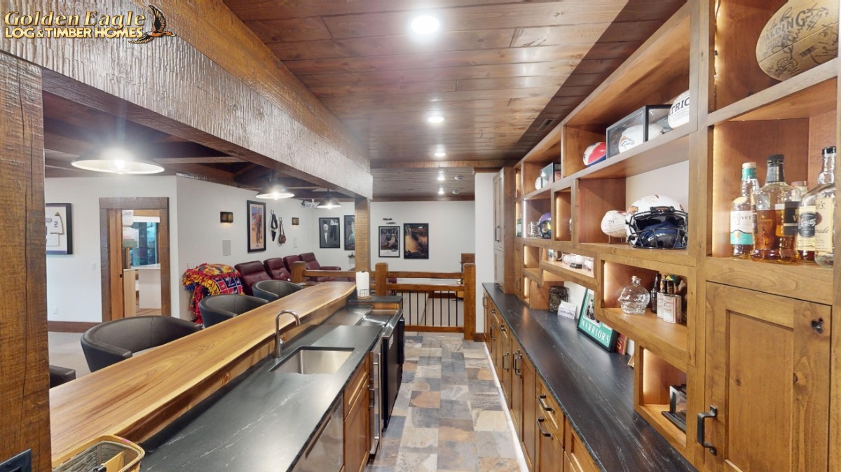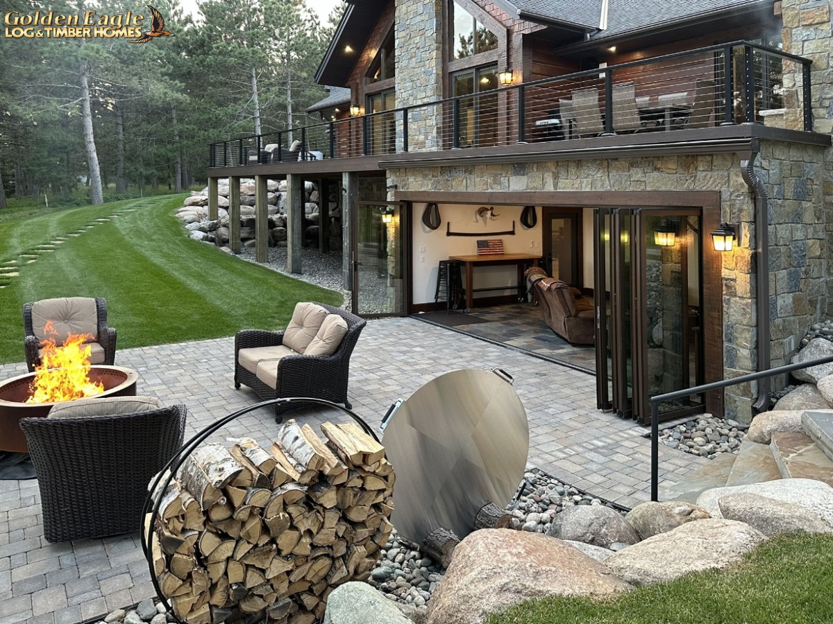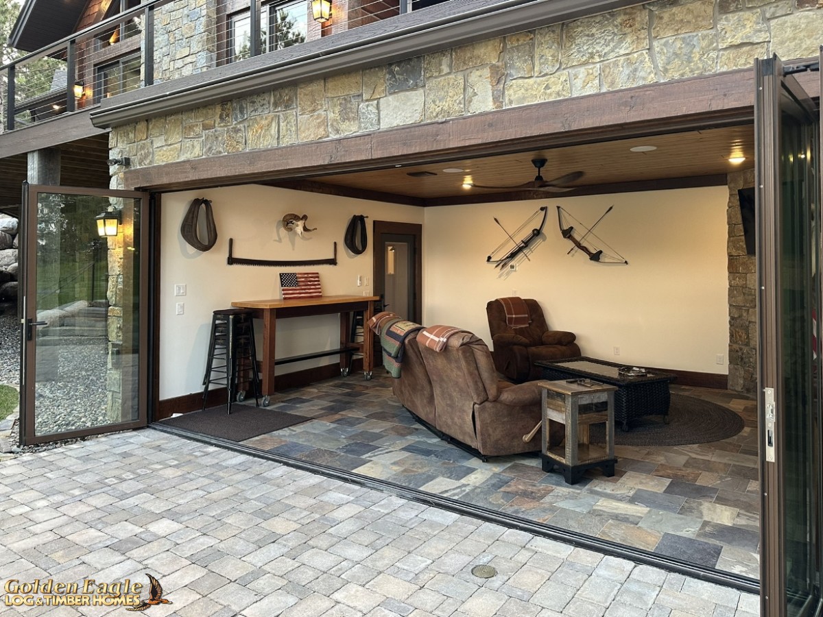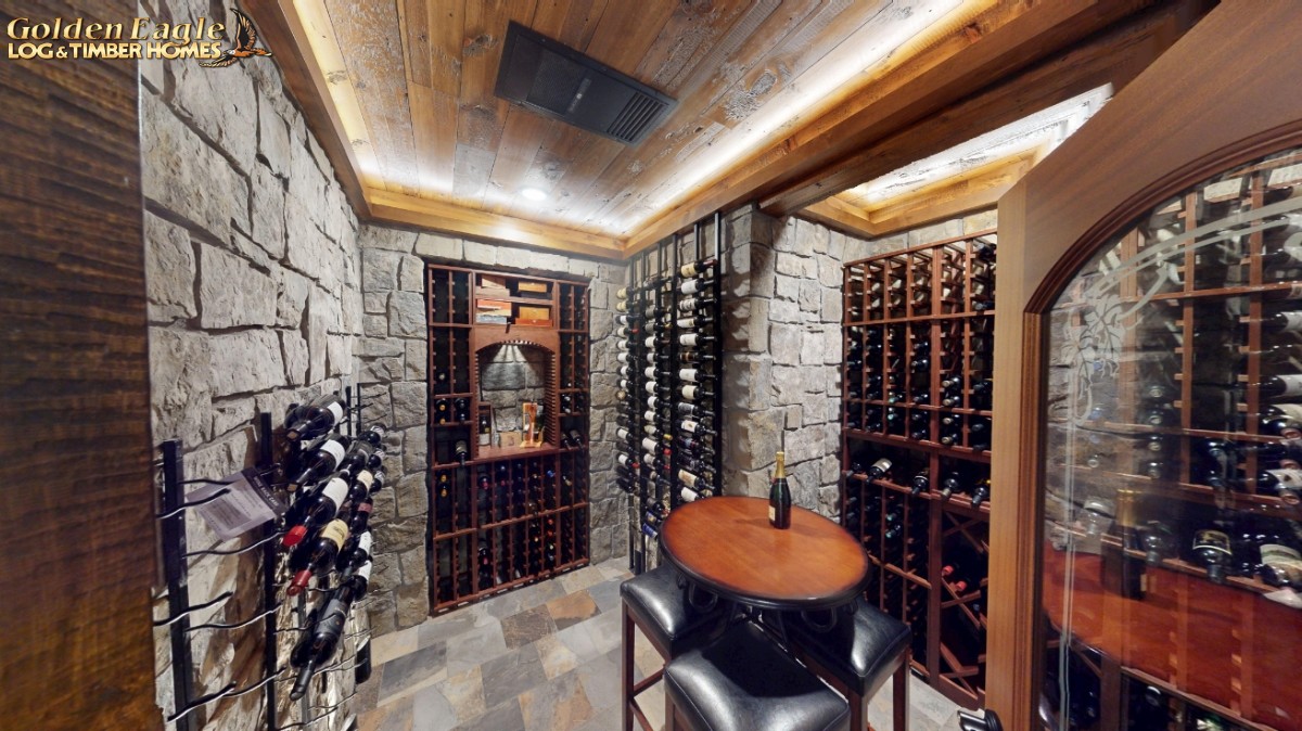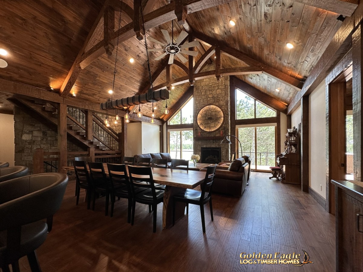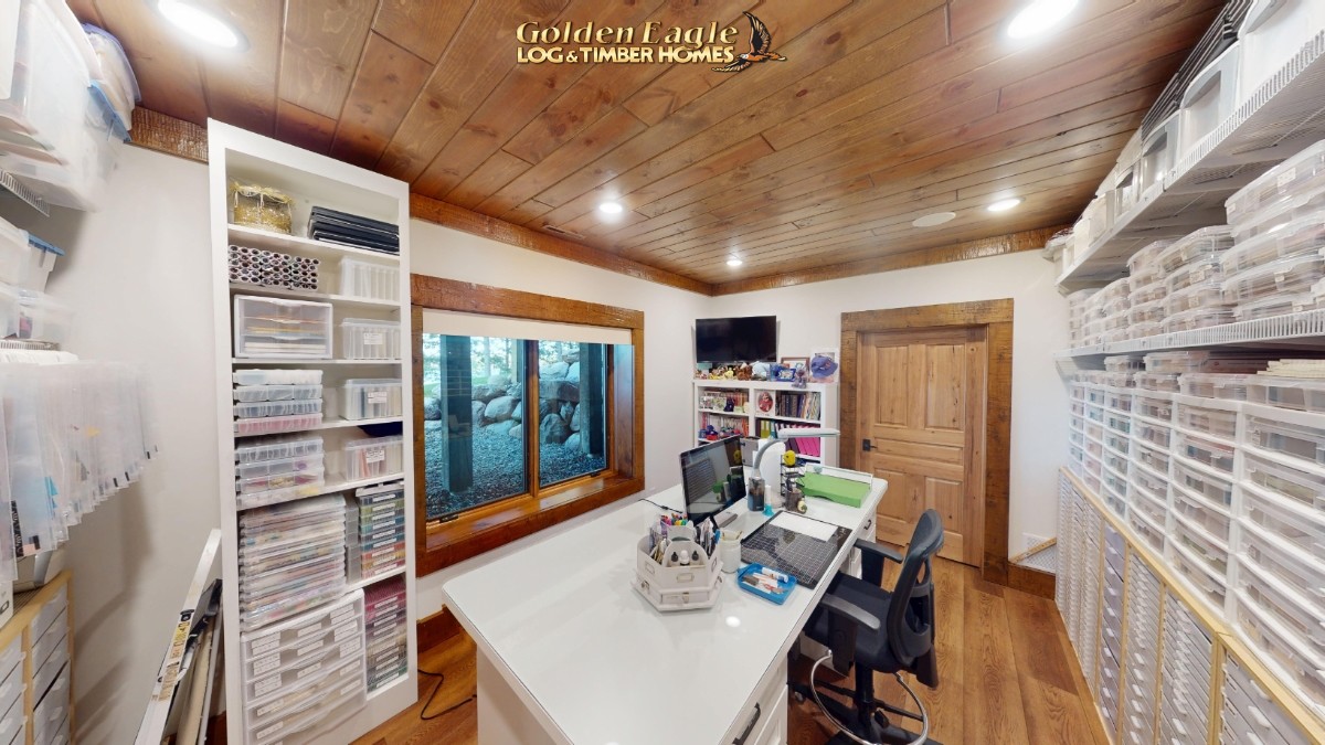 This custom timber frame home offers a thoughtfully designed floor plan with desirable first-floor conveniences, including a laundry room and a master bedroom. The master suite boasts a luxurious bathroom complete with a tiled shower, bathtub, double vanity, and a private toilet room. It also includes a generous walk-in closet and direct access to a deck from the bedroom.
