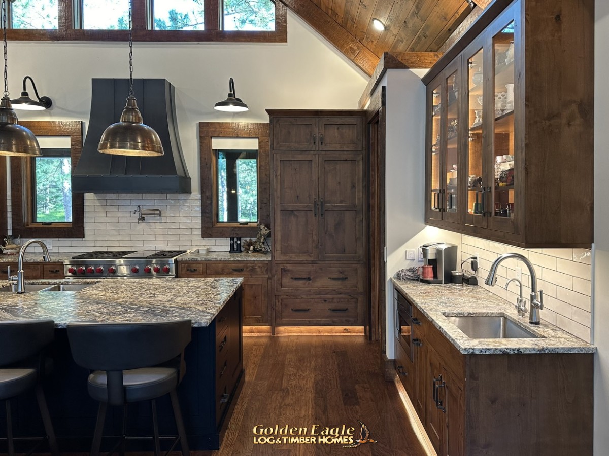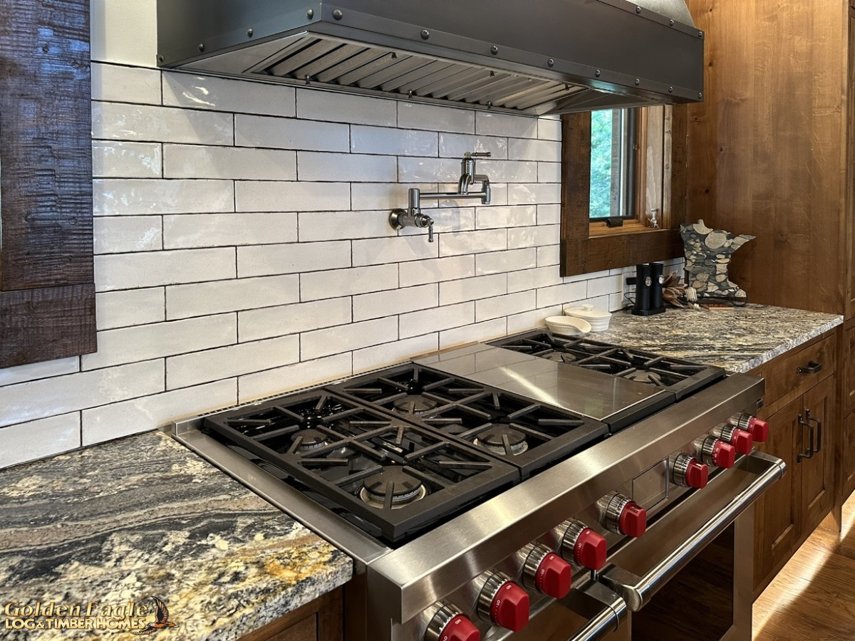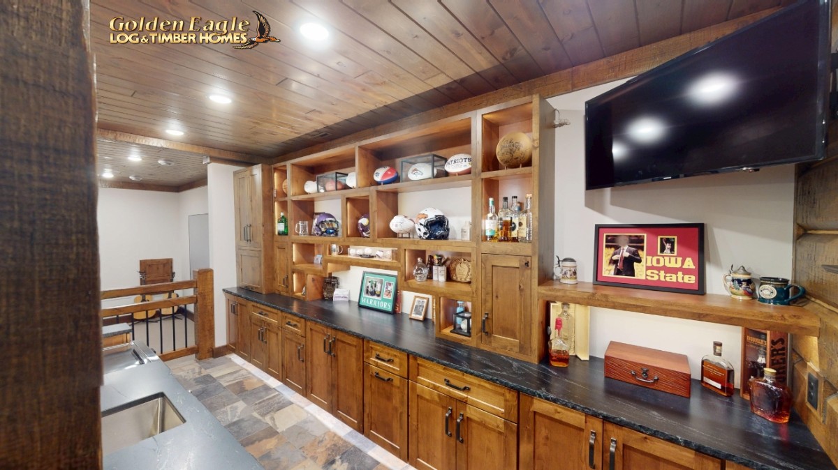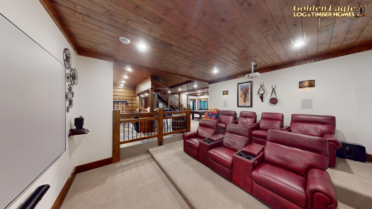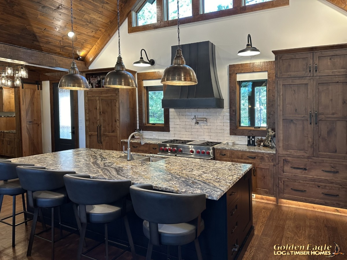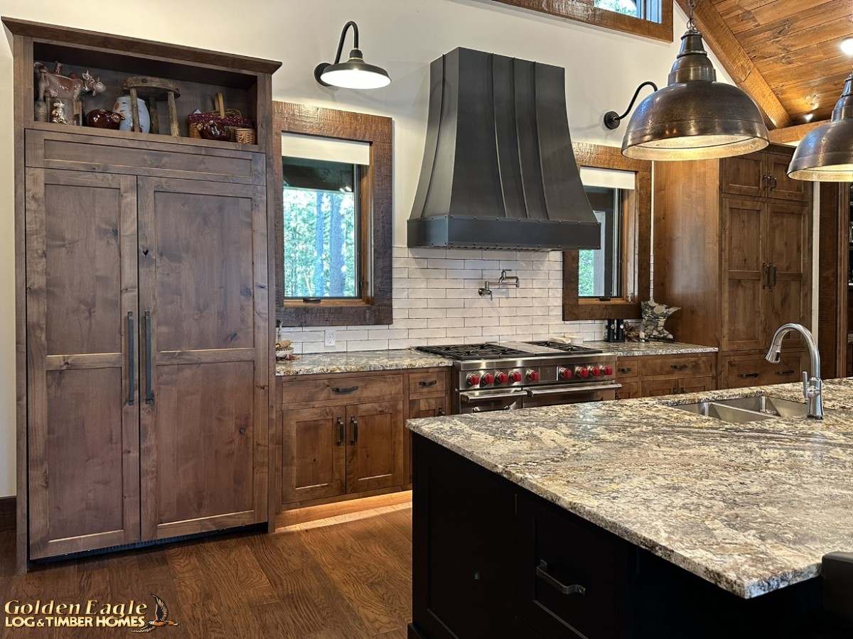 This custom timber frame home offers a thoughtfully designed floor plan with desirable first-floor conveniences, including a laundry room and a master bedroom. The master suite boasts a luxurious bathroom complete with a tiled shower, bathtub, double vanity, and a private toilet room. It also includes a generous walk-in closet and direct access to a deck from the bedroom.