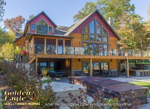 Some of our big log cabin floor plans feature lower levels that lead to a patio or deck. Others have wraparound porches or balconies. The connection with nature sets these large log cabin home plans apart.
