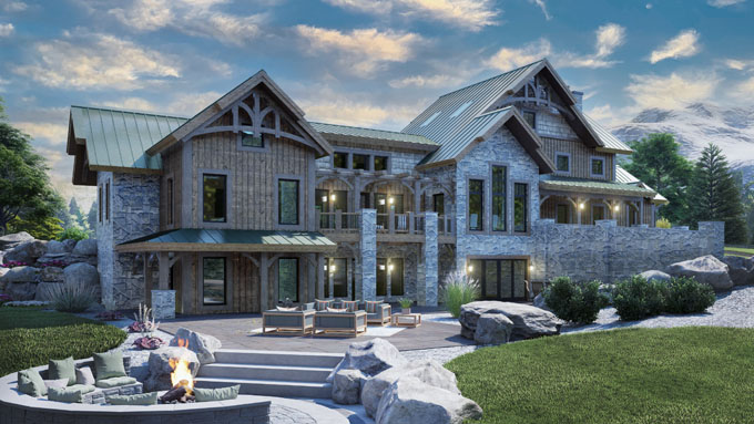 These large timber frame house plans offer plenty of natural light and picturesque views of nature with floor-to-ceiling windows. Stone fireplaces add to the rustic aesthetic of these homes. Granite, marble, and stone countertops can be found in the kitchen and bathrooms.