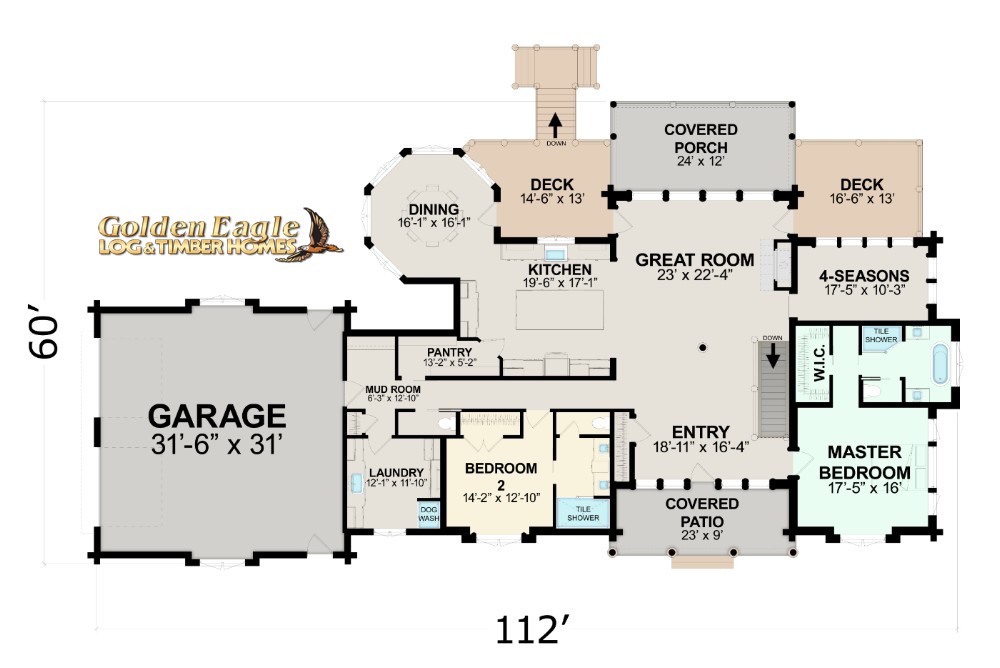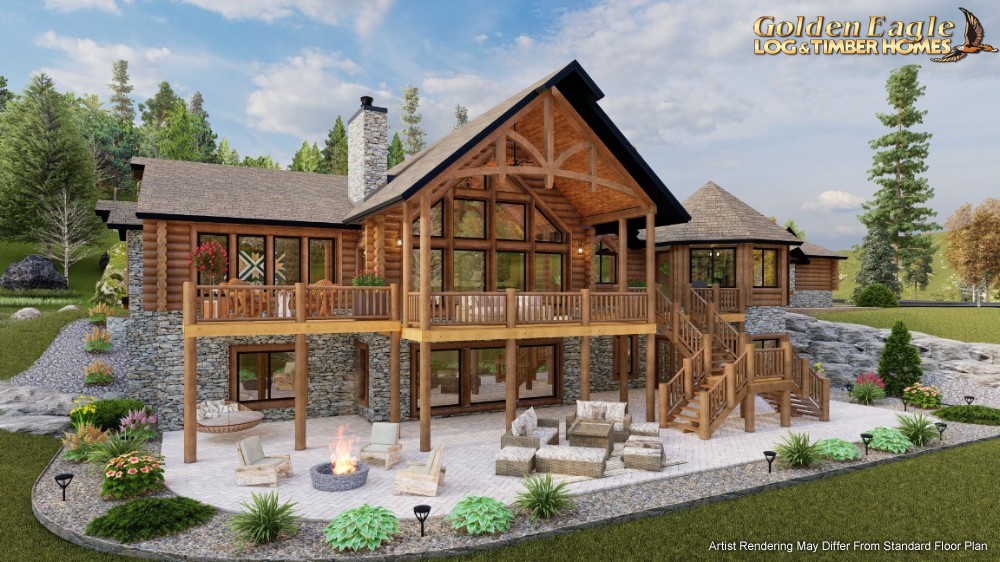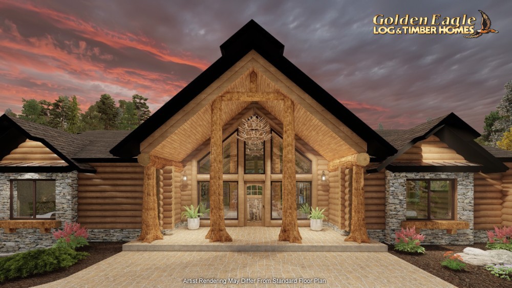 The Baby Bear Lodge Floor Plan can be customized to suit your needs. Like all of our timber frame and log home floor plans, you can add or remove lofts, covered porches, garage stalls, prow walls, patios, and more. While this lodge-style floor plan is a log home, you can choose to make it a timber frame home design or a hybrid construction with both timber and logs. The lodge design can also be flipped in any orientation to better suit your property.