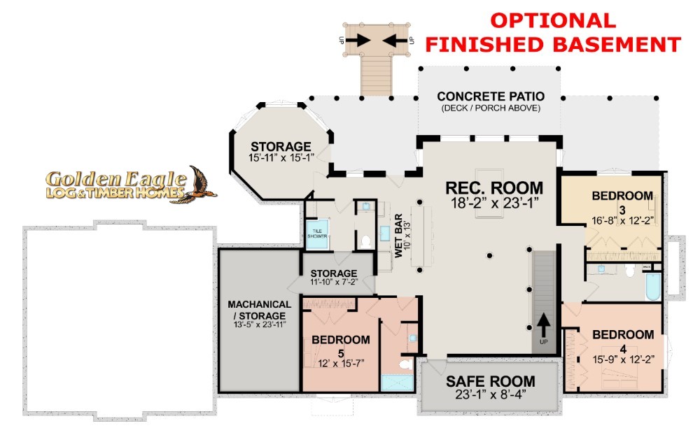 If designed with a finished lower level, this lodge-style home floor plan offers a rec room with a wet bar, three additional bedrooms and bathrooms, plenty of storage space, a safe room, and a mechanical room. A walk-out wall leads to a concrete patio with a fire pit.