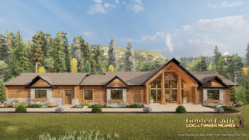 Our Baby Bear Lodge Floor Plan is meticulously designed to blend comfort, luxury, and exquisite craftsmanship. This ranch-style log home plan can be designed with or without a lower level for even more living space. The log lodge plan features two to five bedrooms and two to five bathrooms, depending on whether you choose to add a basement.